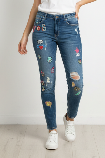 Blugi Zara pentru damă, mărimea 36 (S), cu design modern și aplicații decorative cusute. Model...