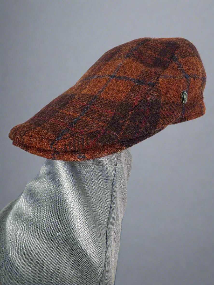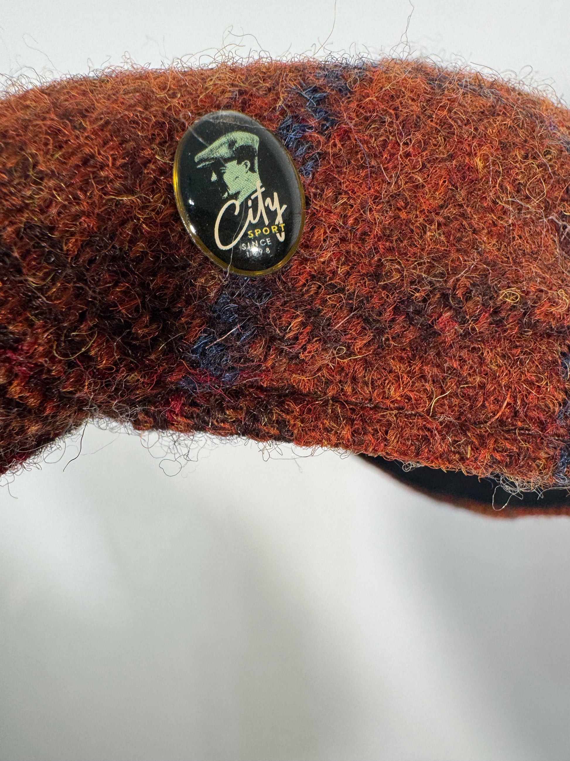Bască elegantă City Sport, confecționată manual din material autentic Harris Tweed, celebru pentru calitatea și durabilitatea sa. Designul clasic în carouri și tonurile calde de portocaliu, maro și albastru oferă un aer rafinat, potrivit atât pentru ținute casual, cât și smart-casual.