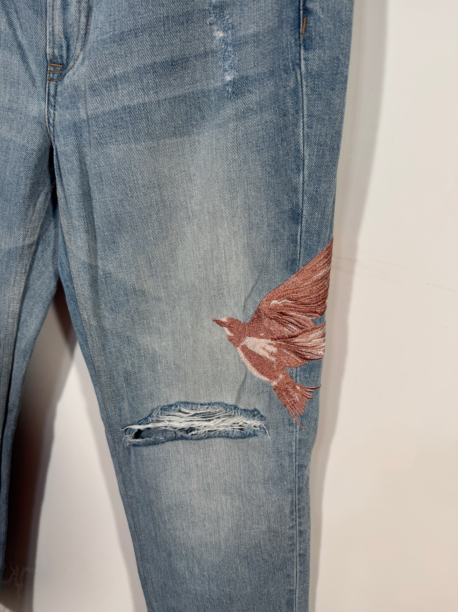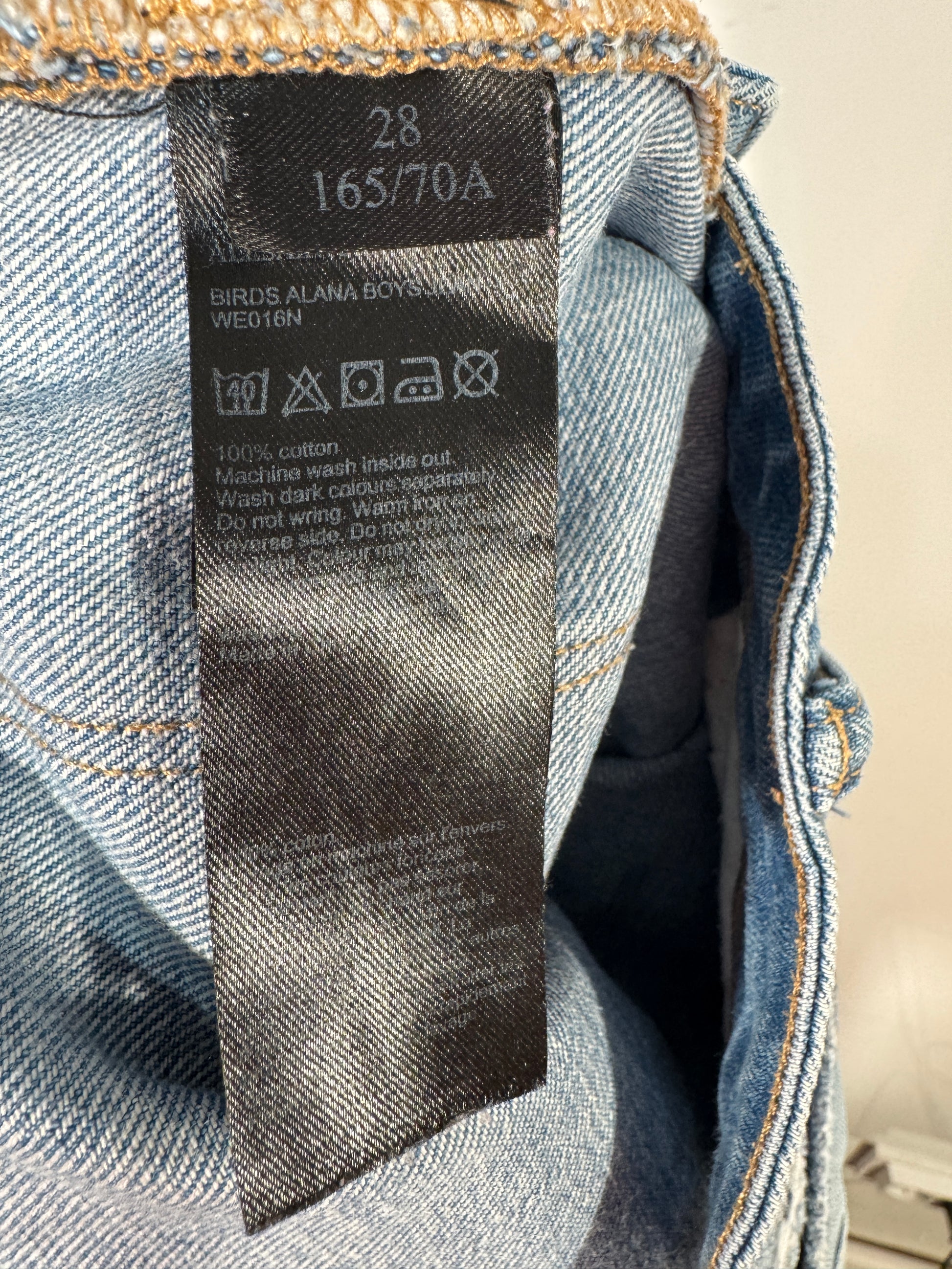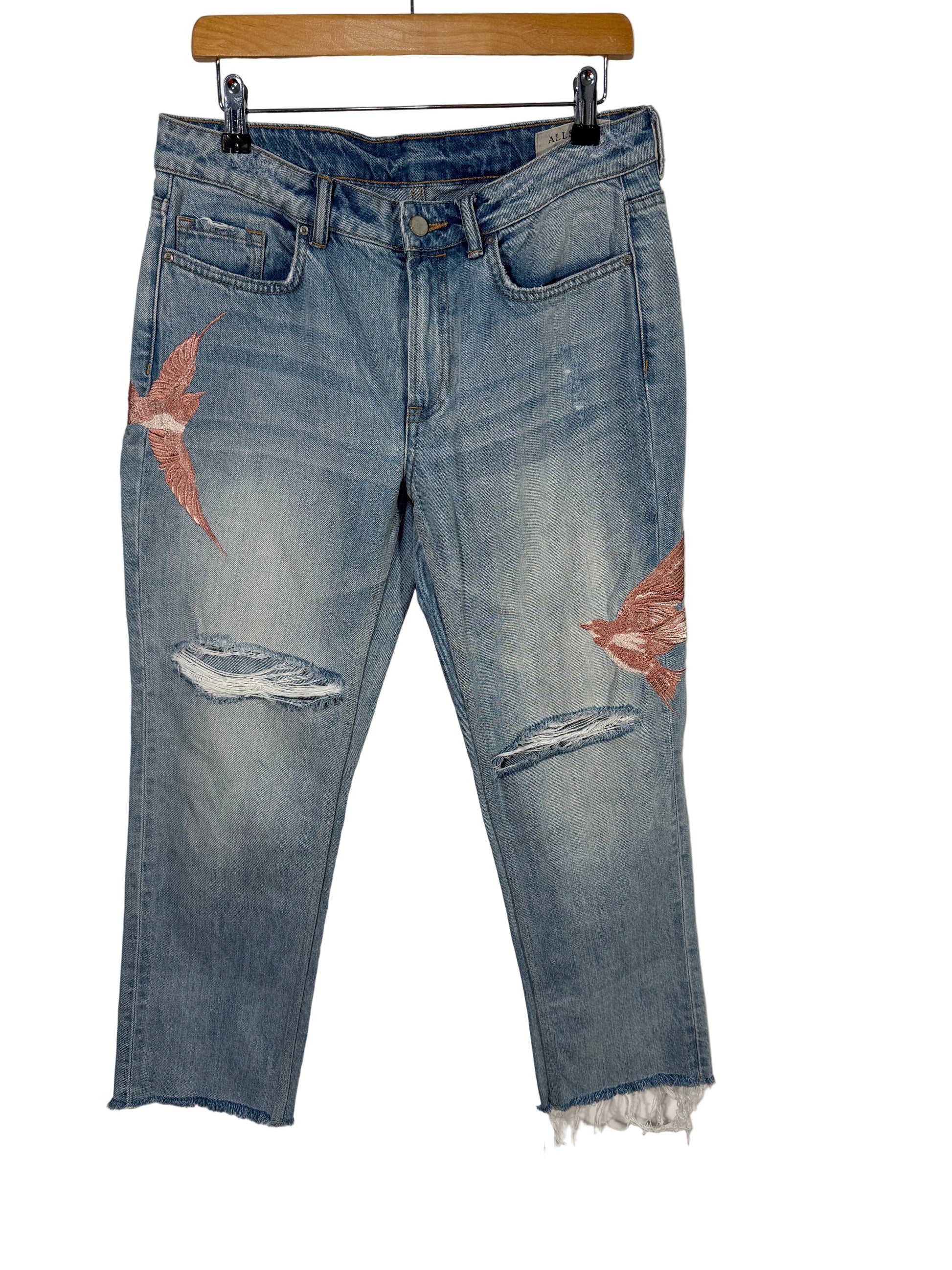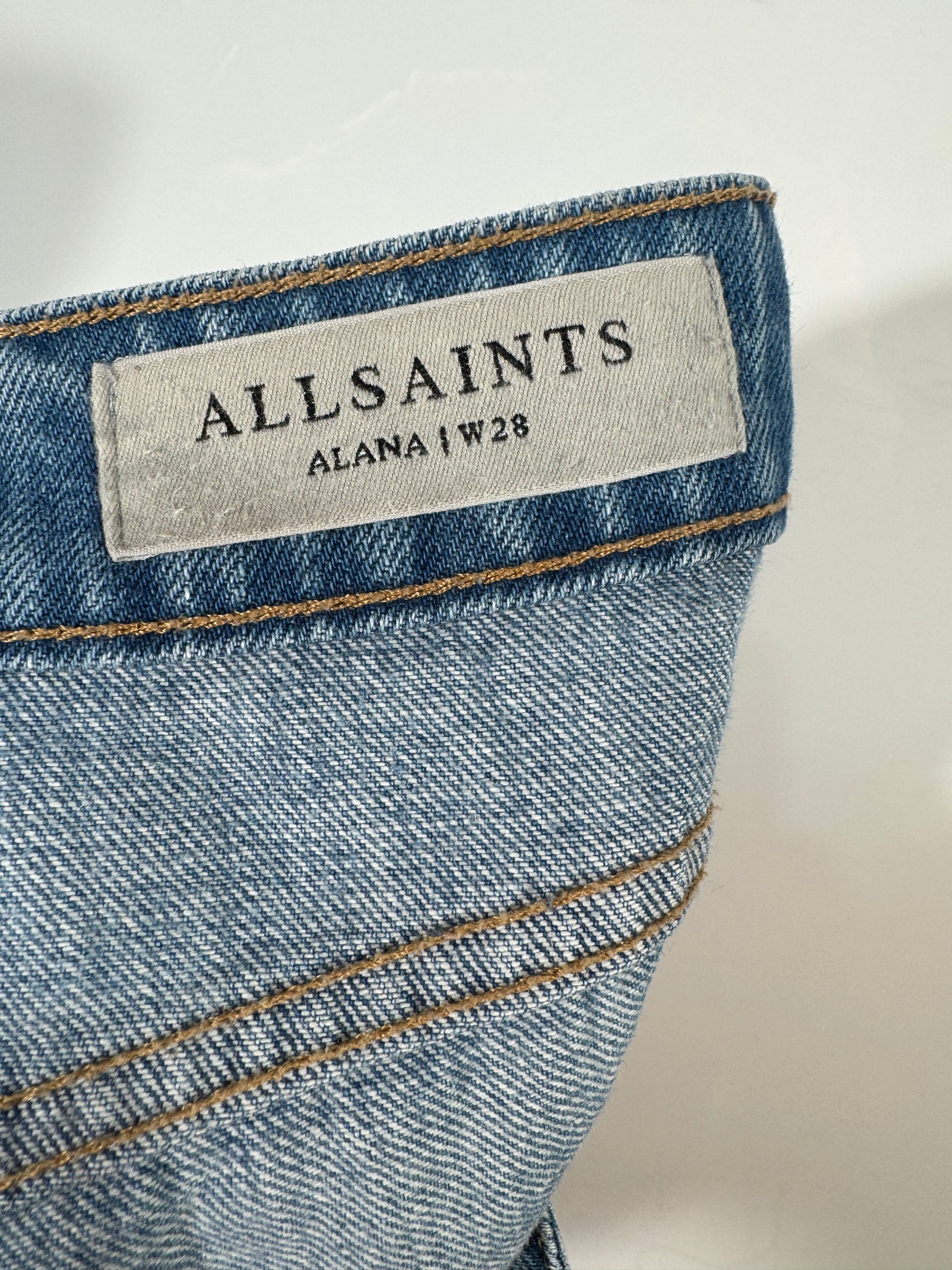 Blugi AllSaints Alana pentru dama, model modern cu detalii decorative si efect usor uzat. Au croiala dreapta, talie medie si terminatie nefinisata la baza, oferind un look casual cu personalitate. Designul este completat de aplicatii decorative si zone cu efect de uzura controlata.