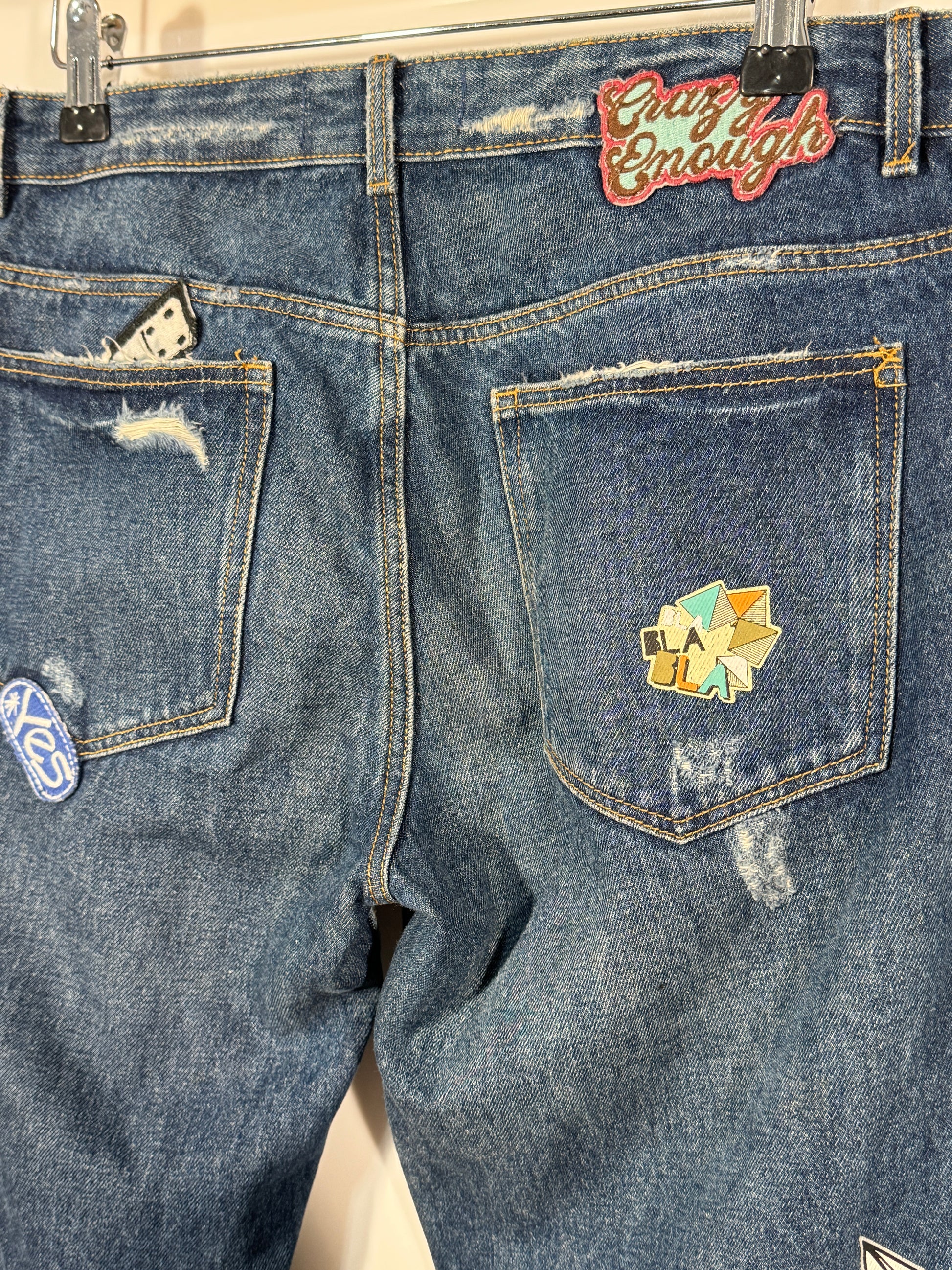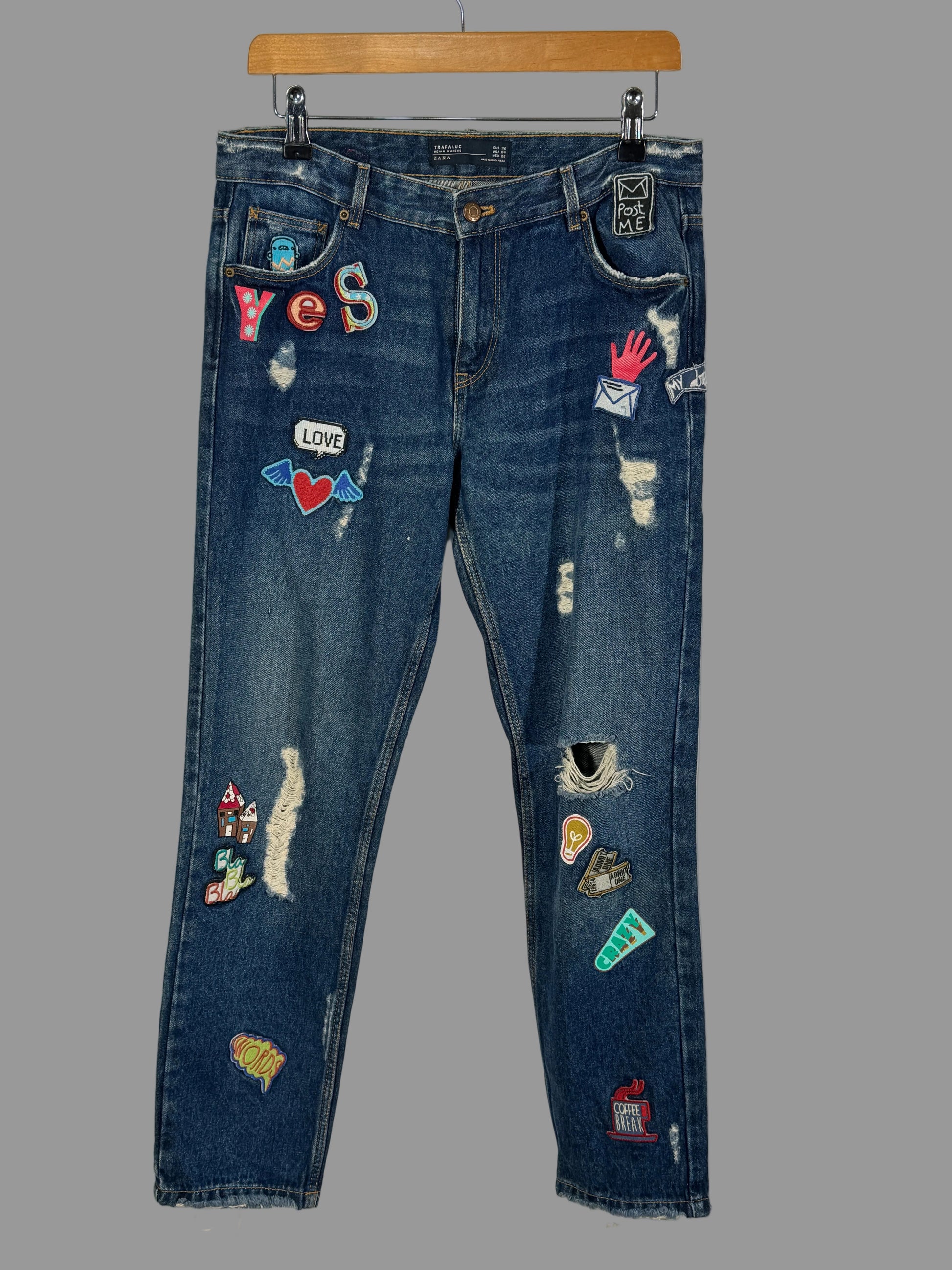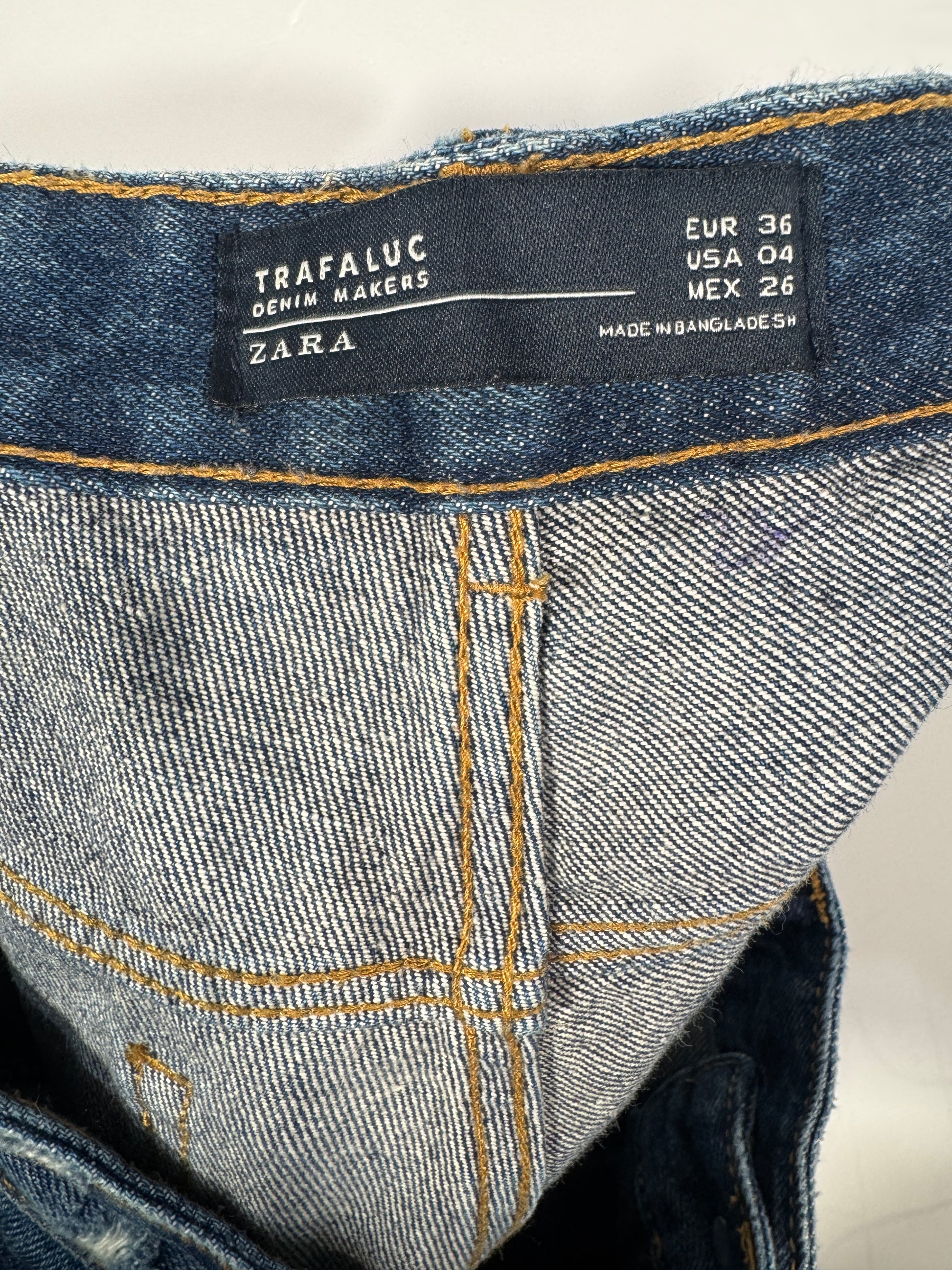 Blugi Zara pentru damă, mărimea 36 (S), cu design modern și aplicații decorative cusute. Model statement, ideal pentru ținute casual sau streetwear, ușor de integrat în outfituri urbane sau smart-casual.