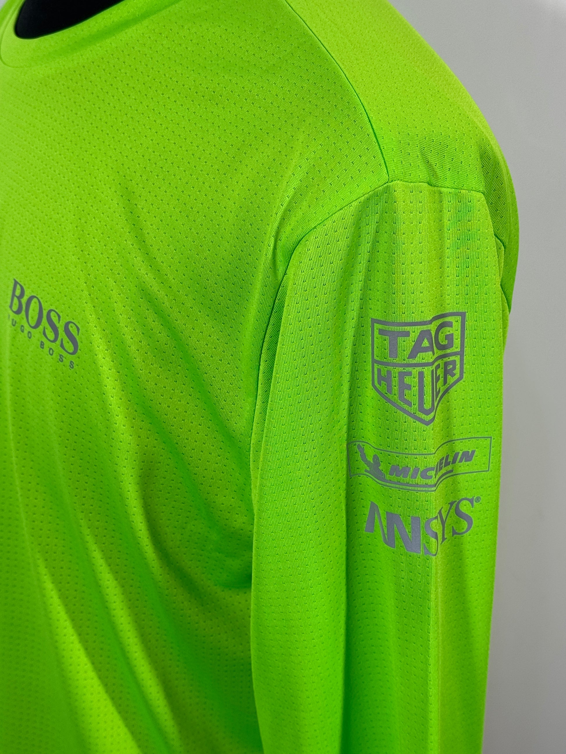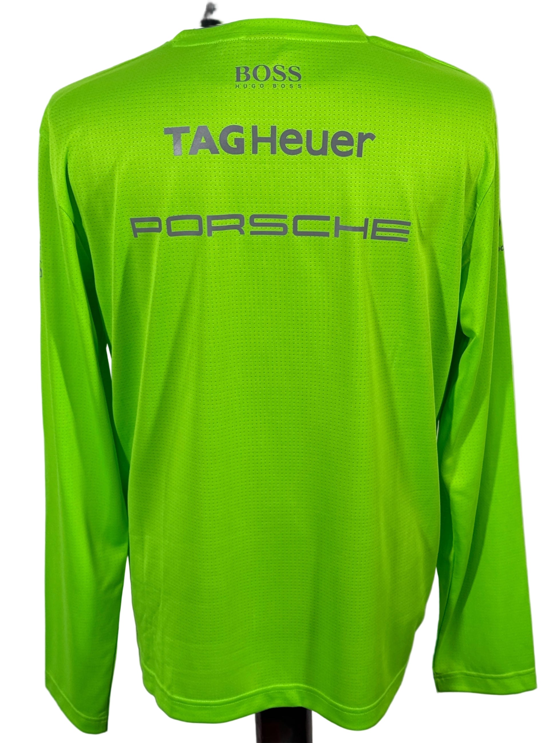 Logo-uri oficiale BOSS, Porsche, Mobil 1 și TAG Heuer imprimate pe piept și mâneci.