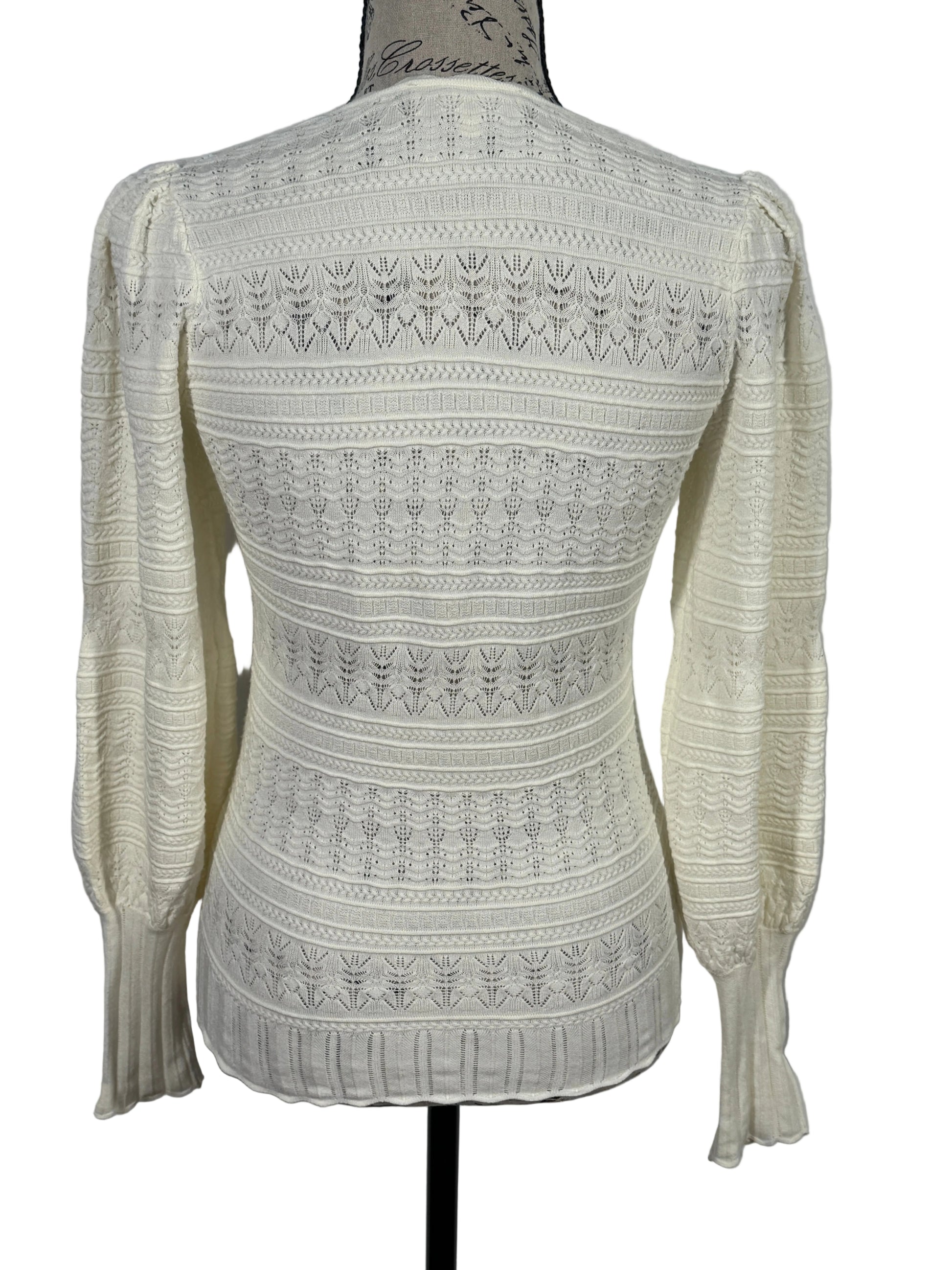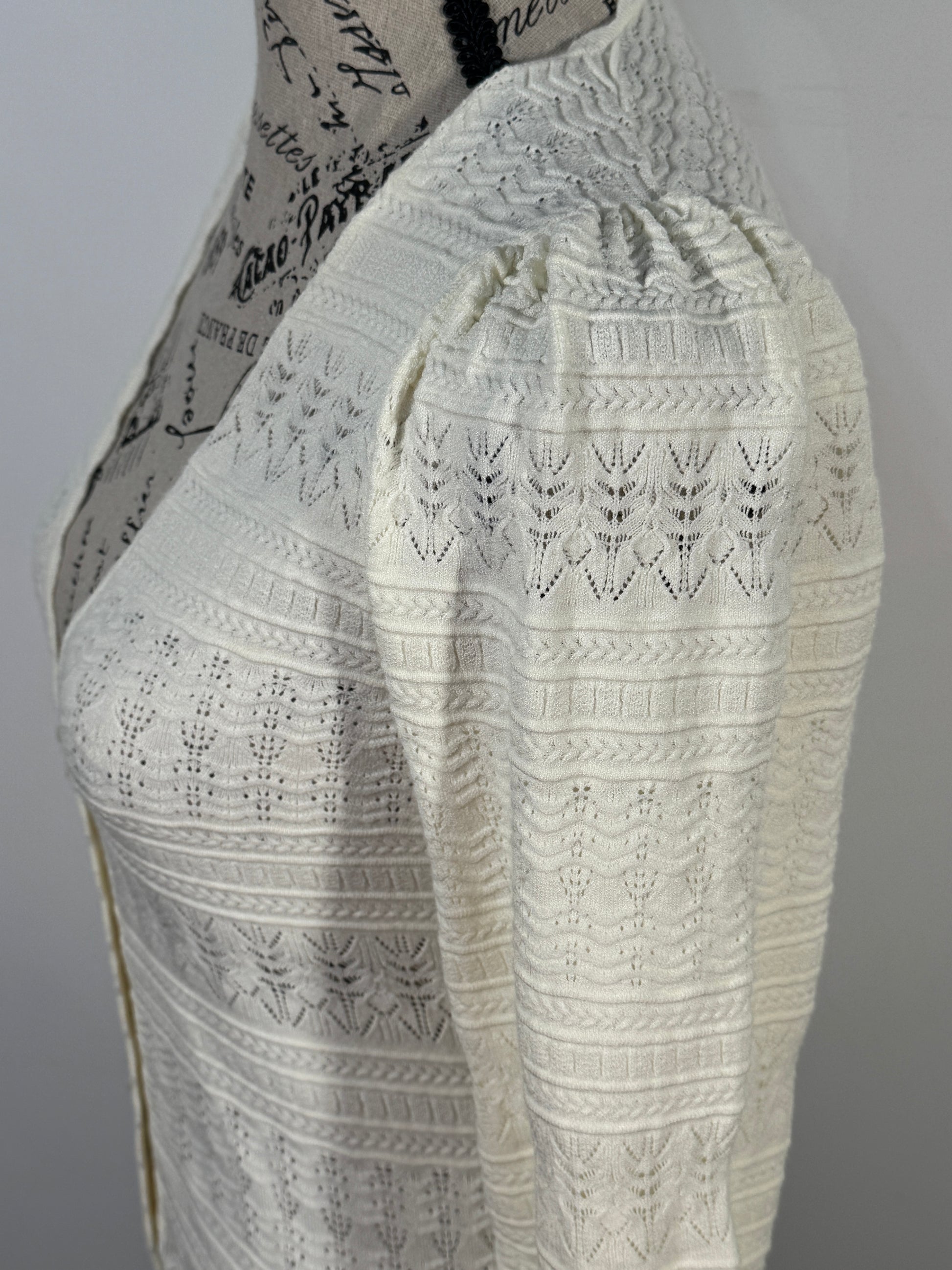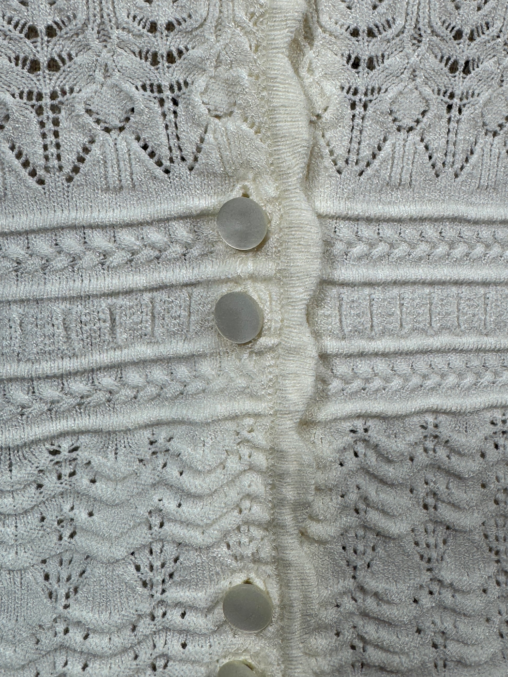 Bluza eleganta La Maille by Sezane Paris, realizata din tricot fin, cu model ajurat si croiala feminina care evidentiaza talia. Designul cu nasturi pe fata si decolteu in V o face usor de integrat atat in tinute casual-chic, cat si in outfituri mai elegante.