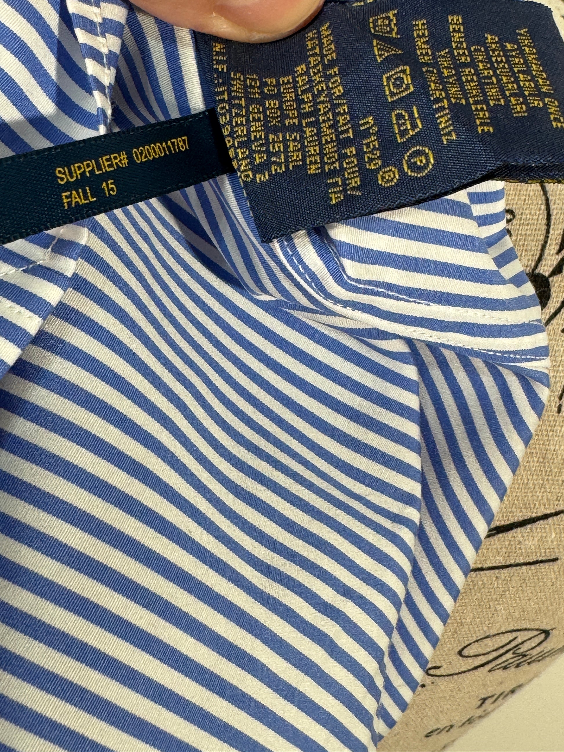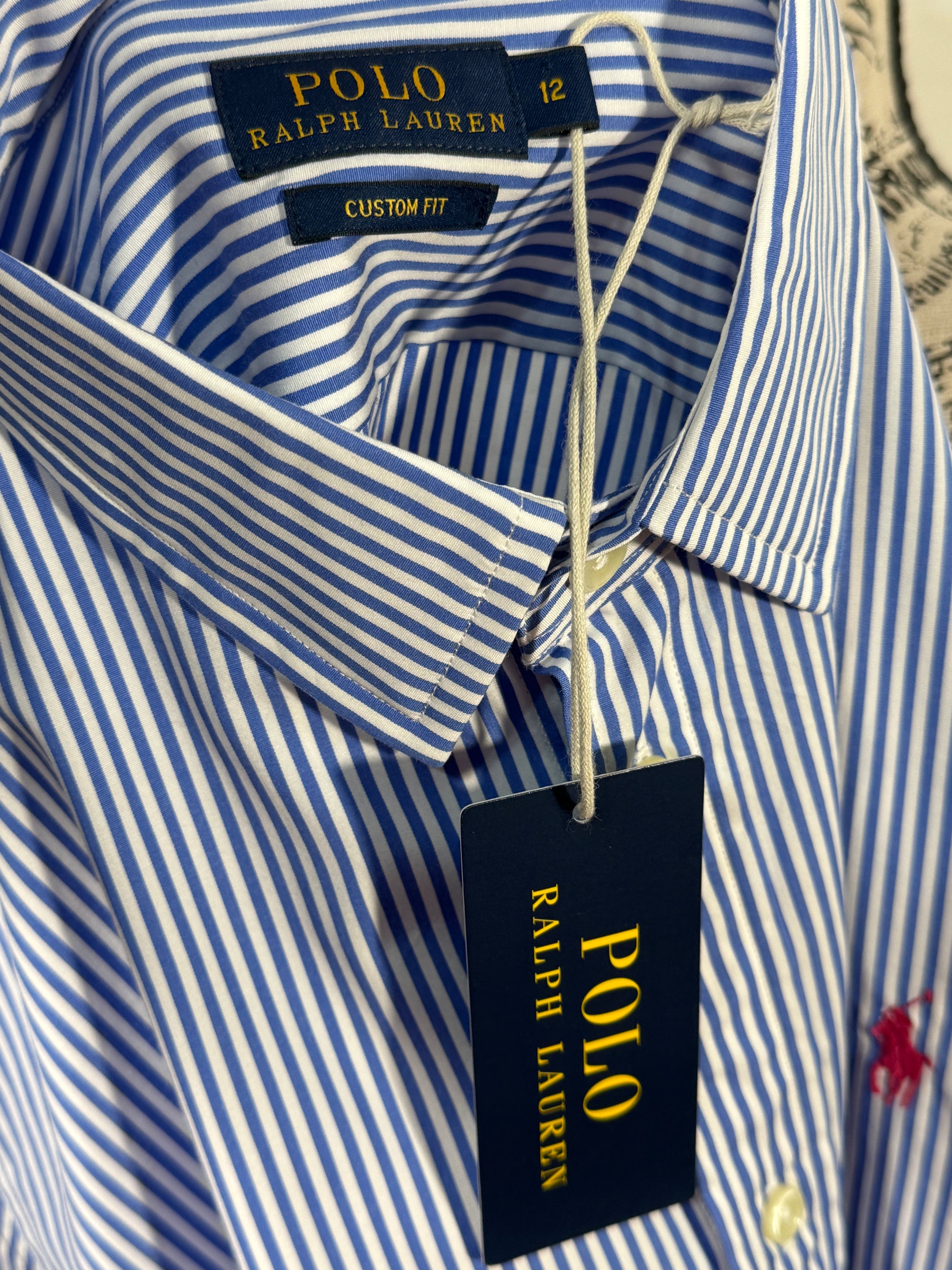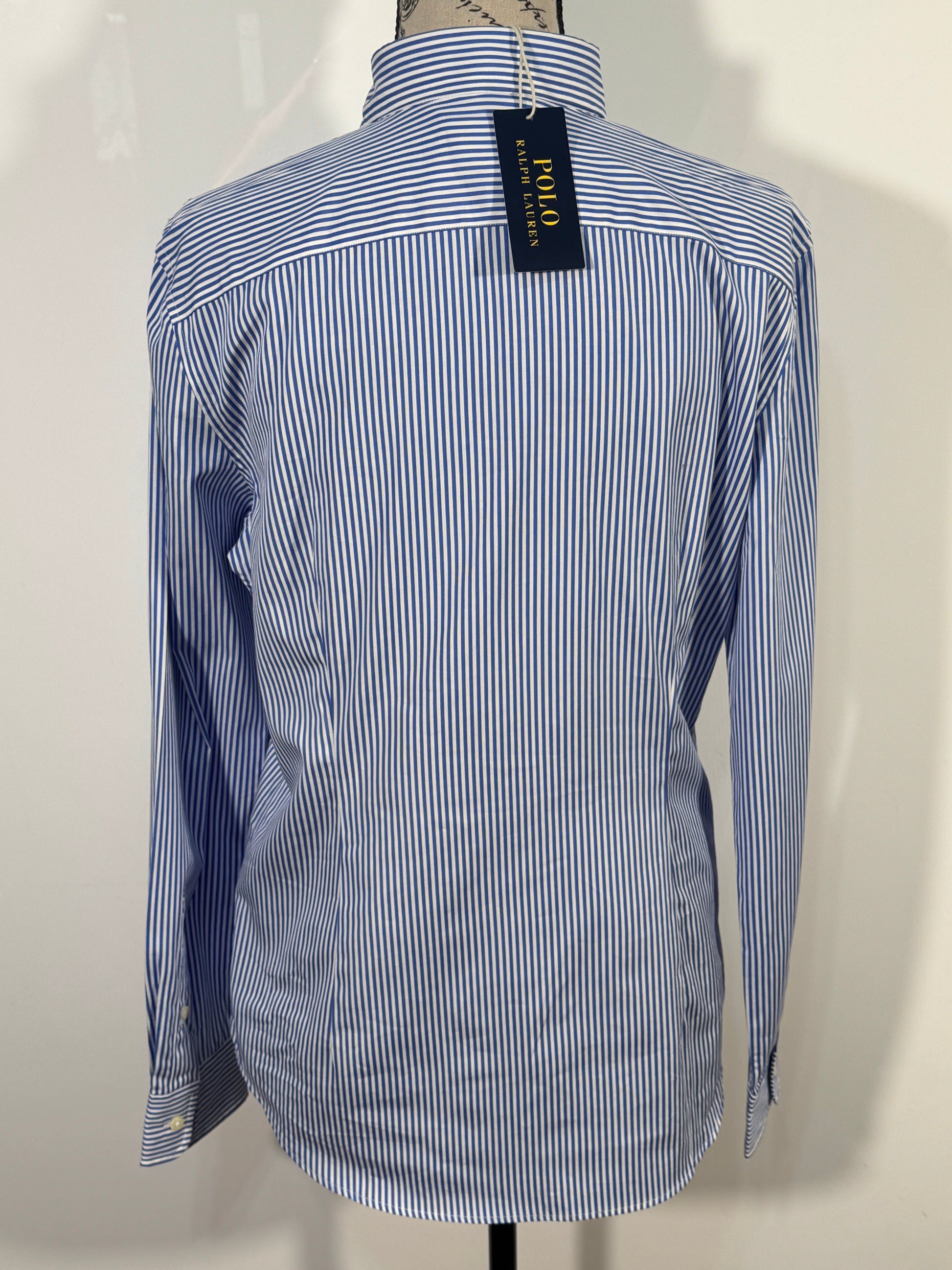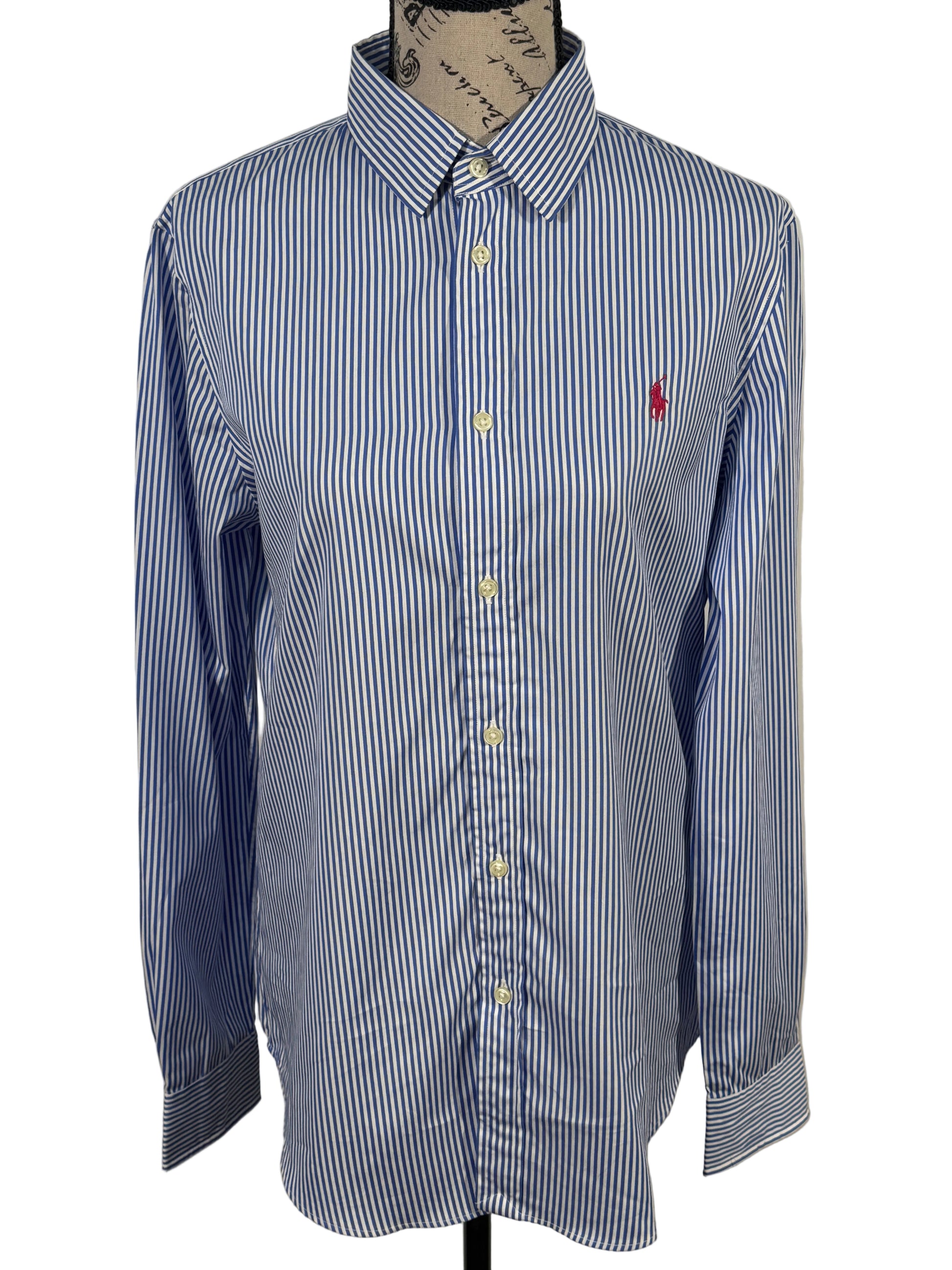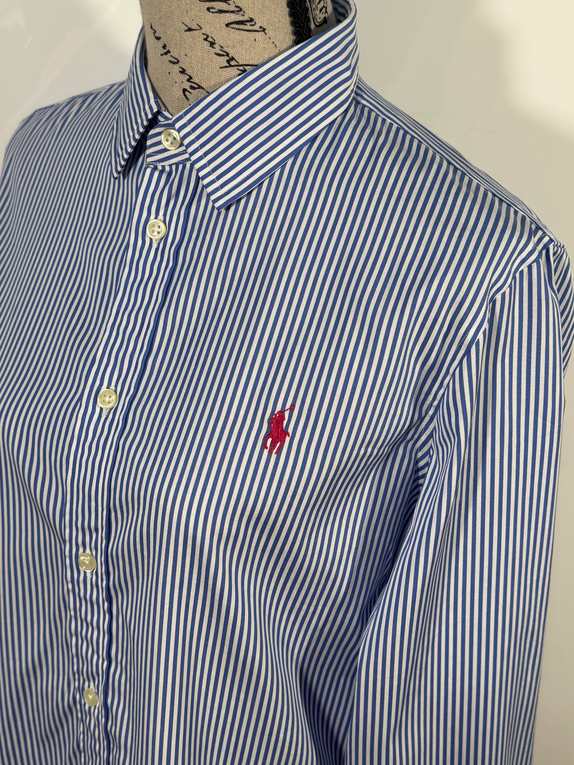 Camasa Polo Ralph Lauren pentru dama, marimea M–L, cu model in dungi alb-albastru si logo brodat pe piept. Croi cambrat, elegant, potrivit atat pentru tinute office, cat si pentru tinute casual. Material usor si confortabil, placut la purtare. Se inchide cu nasturi pe fata.