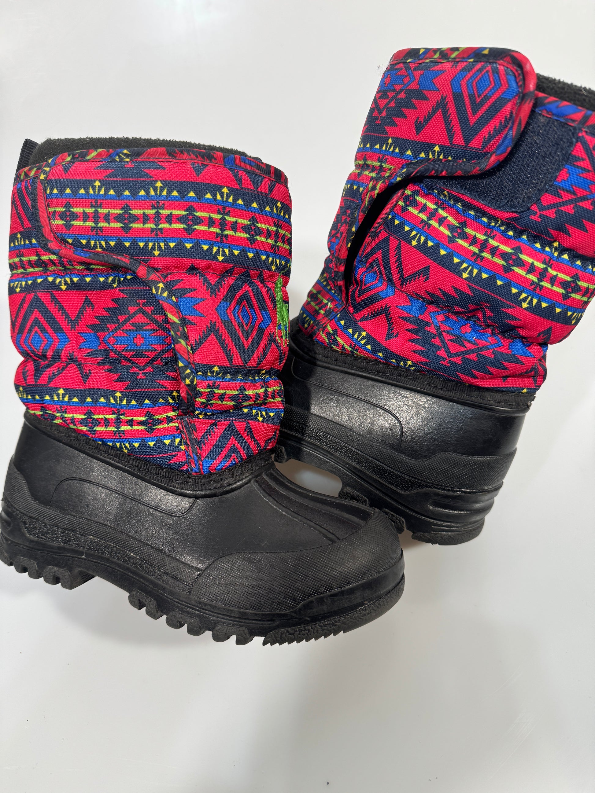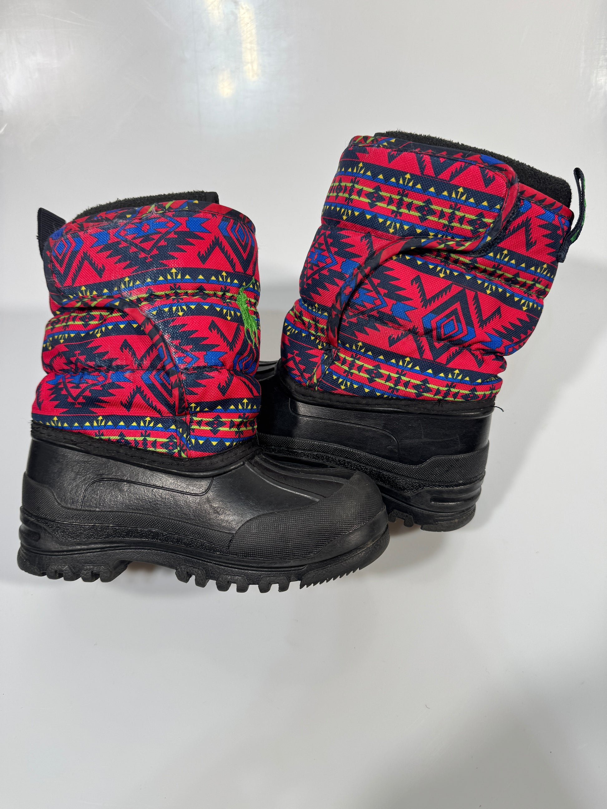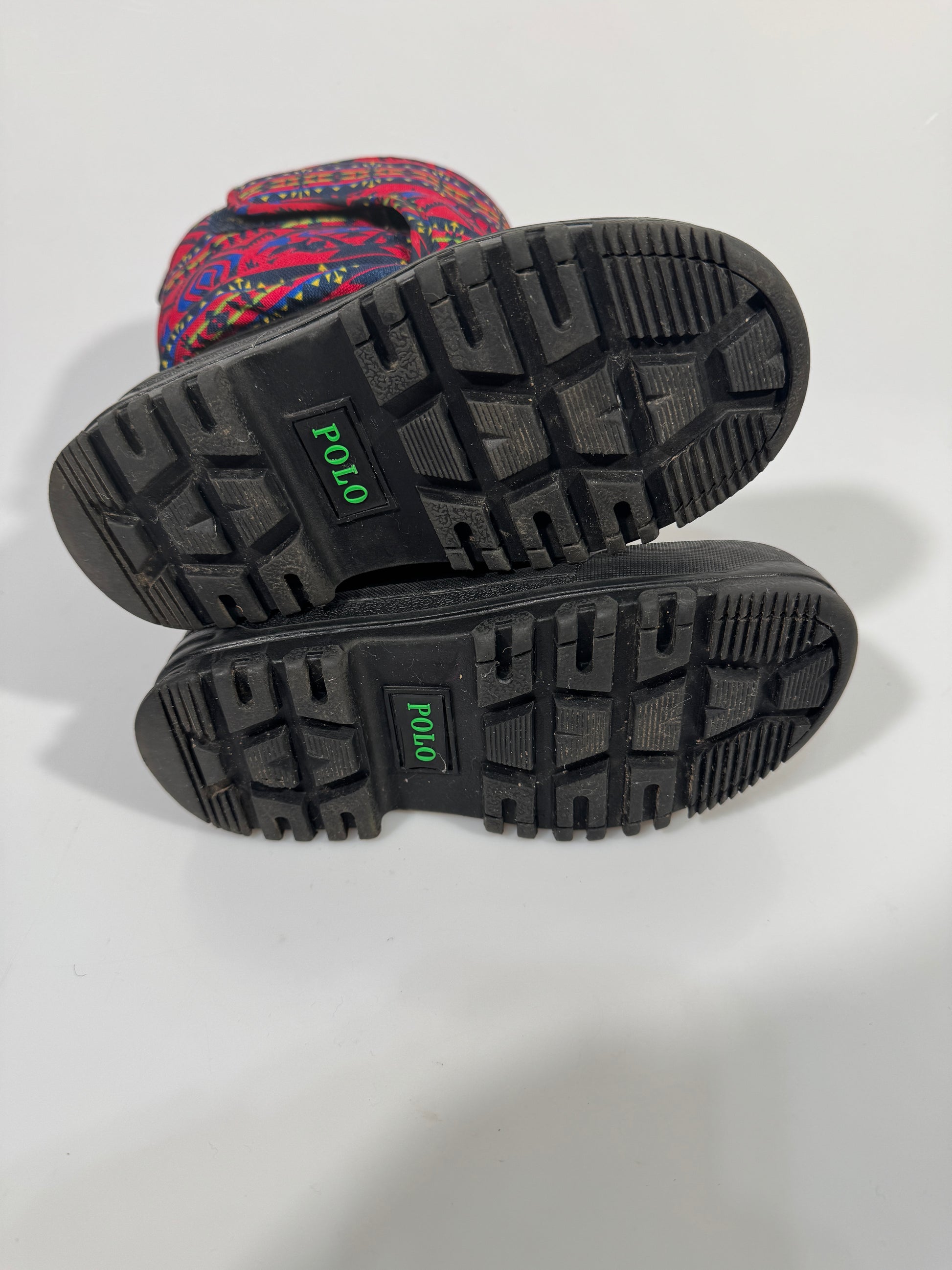 Partea inferioara este din cauciuc impermeabil, iar partea superioara din material textil gros, cu imprimeu geometric colorat si logo Polo Ralph Lauren brodat.