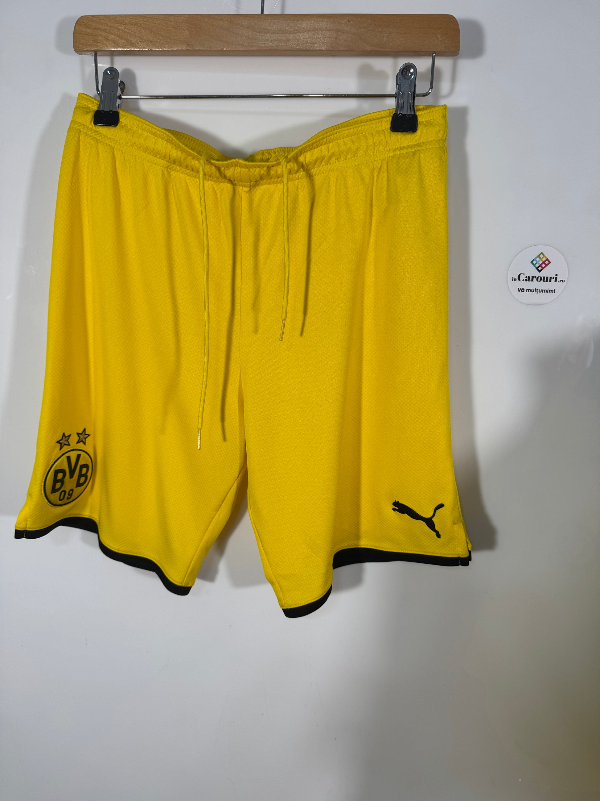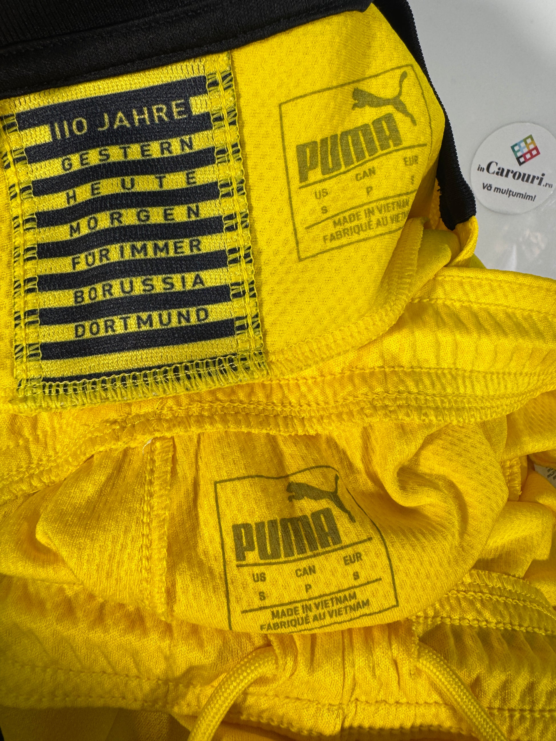 Echipament original Borussia Dortmund Puma, format din tricou și pantaloni scurți, pentru bărbați. Model oficial, în culorile galben-negru, cu logo-ul clubului brodat și sponsor imprimat. Realizat din material tehnic respirabil, conceput pentru sport și purtare confortabilă.