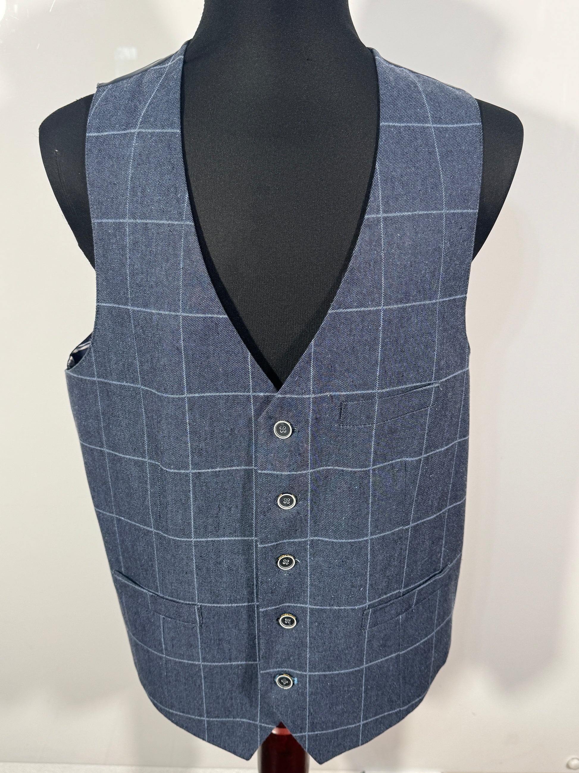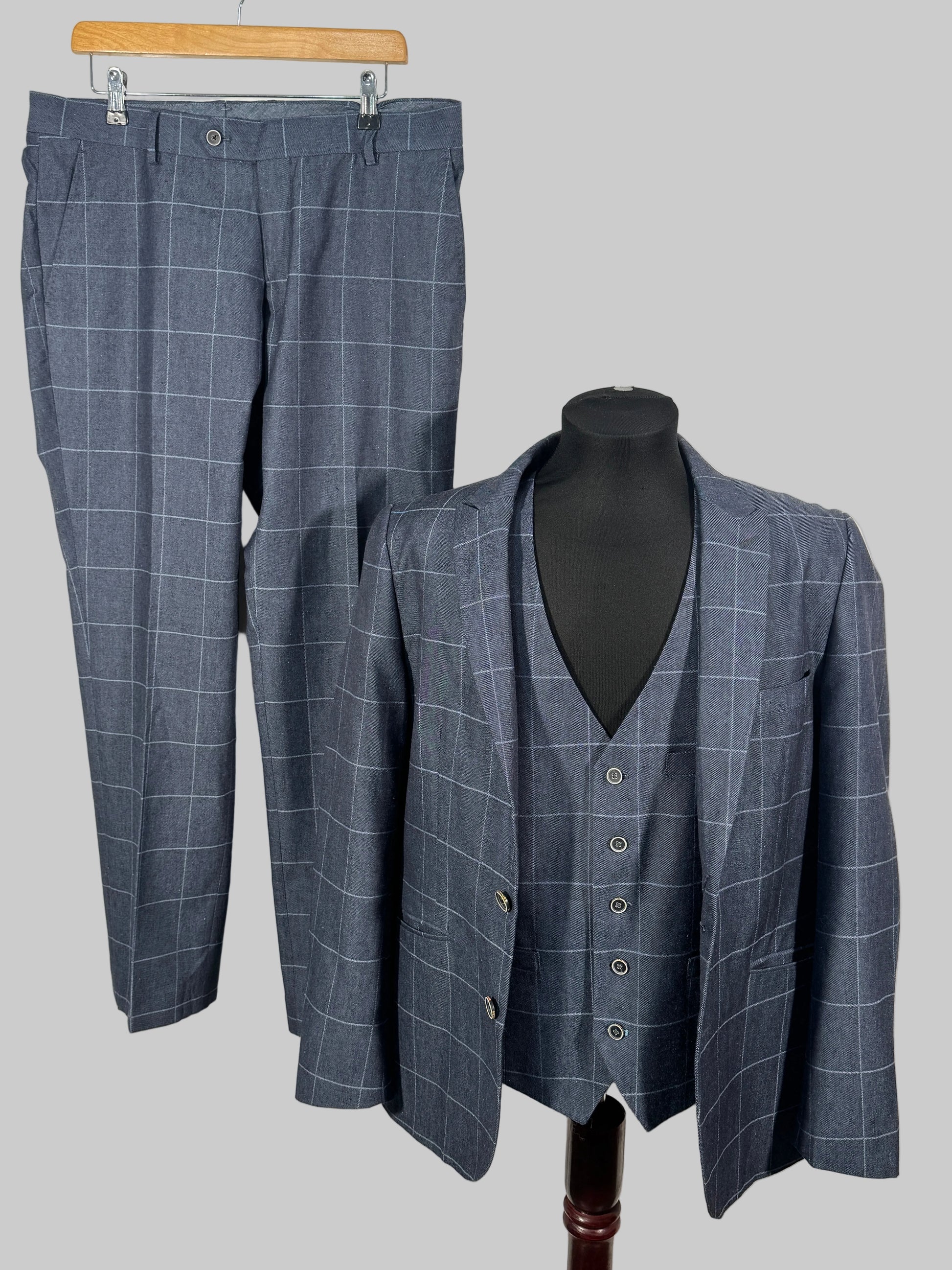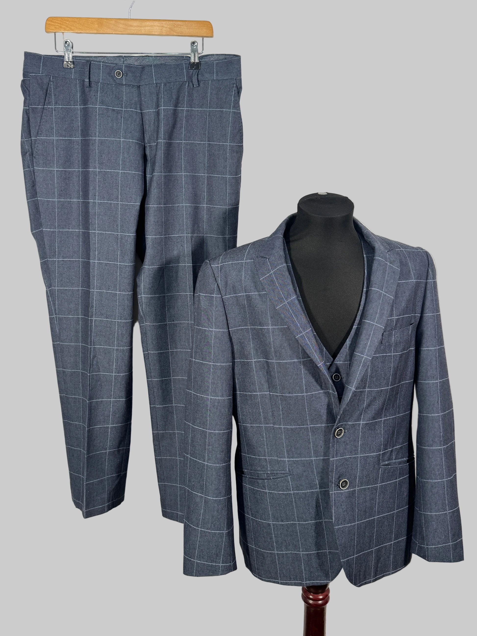 Costum Spitalfields Luxury Fabrics pentru bărbați, realizat din materiale premium, cu un design elegant în carouri discrete. Sacoul are croială modernă, iar pantalonii completează perfect un look rafinat, ideal pentru evenimente, birou sau ocazii speciale.