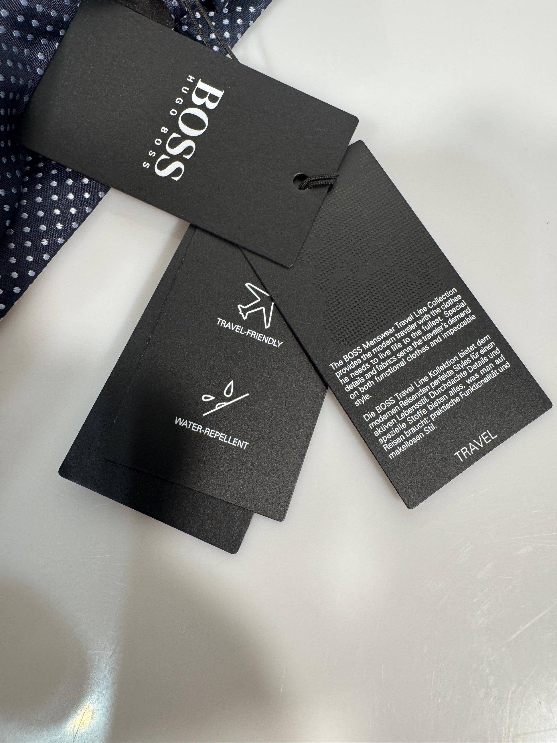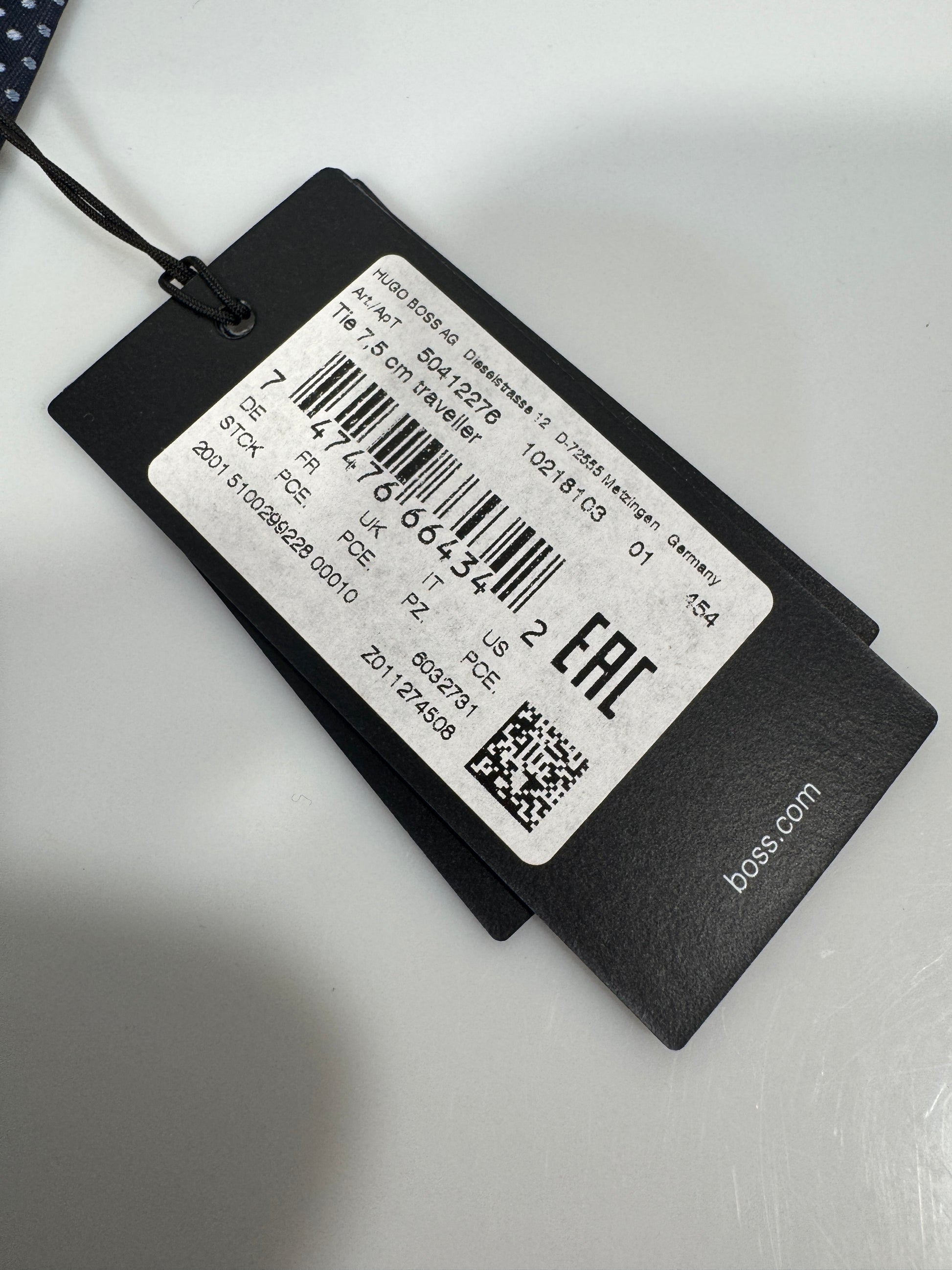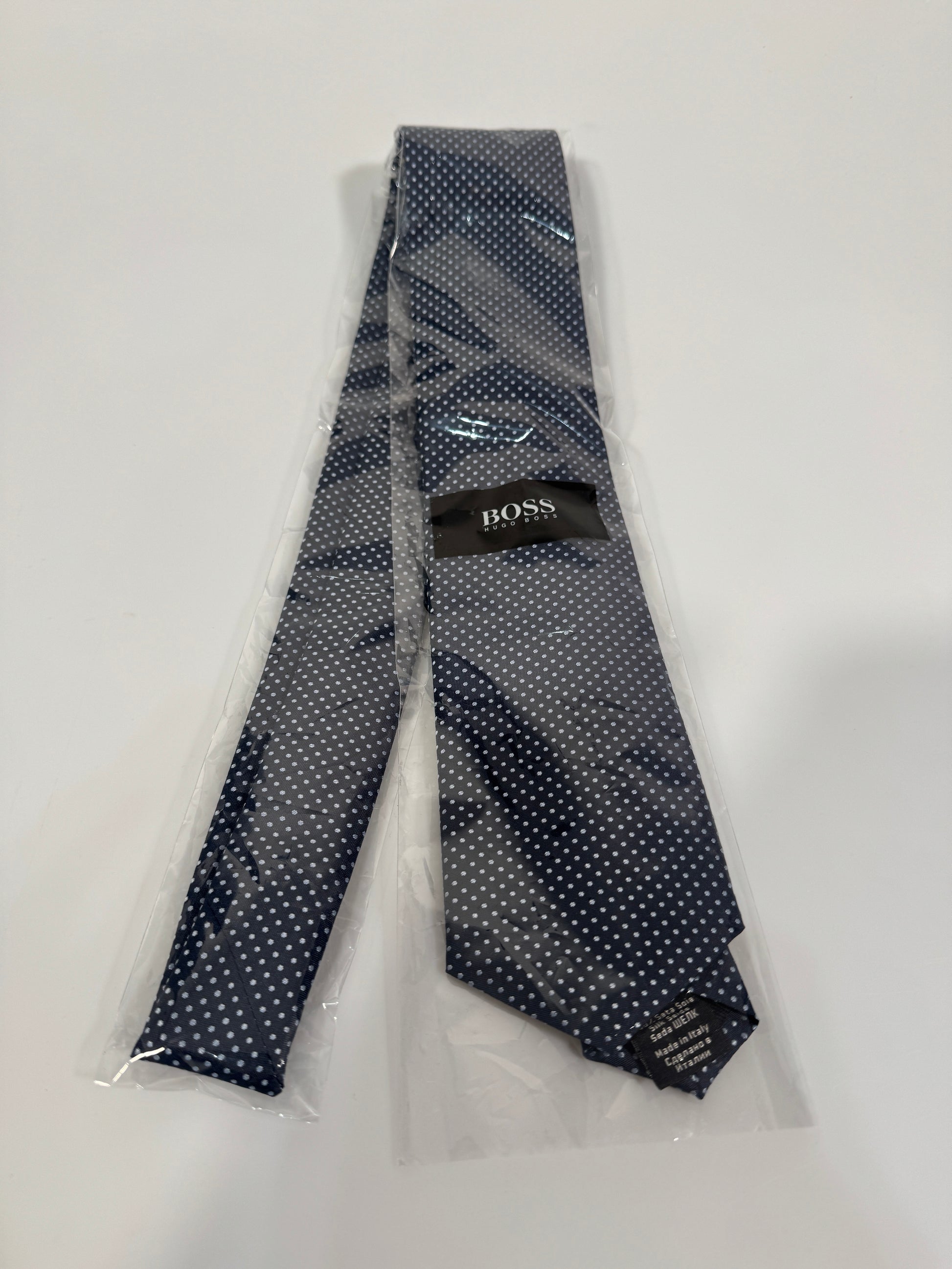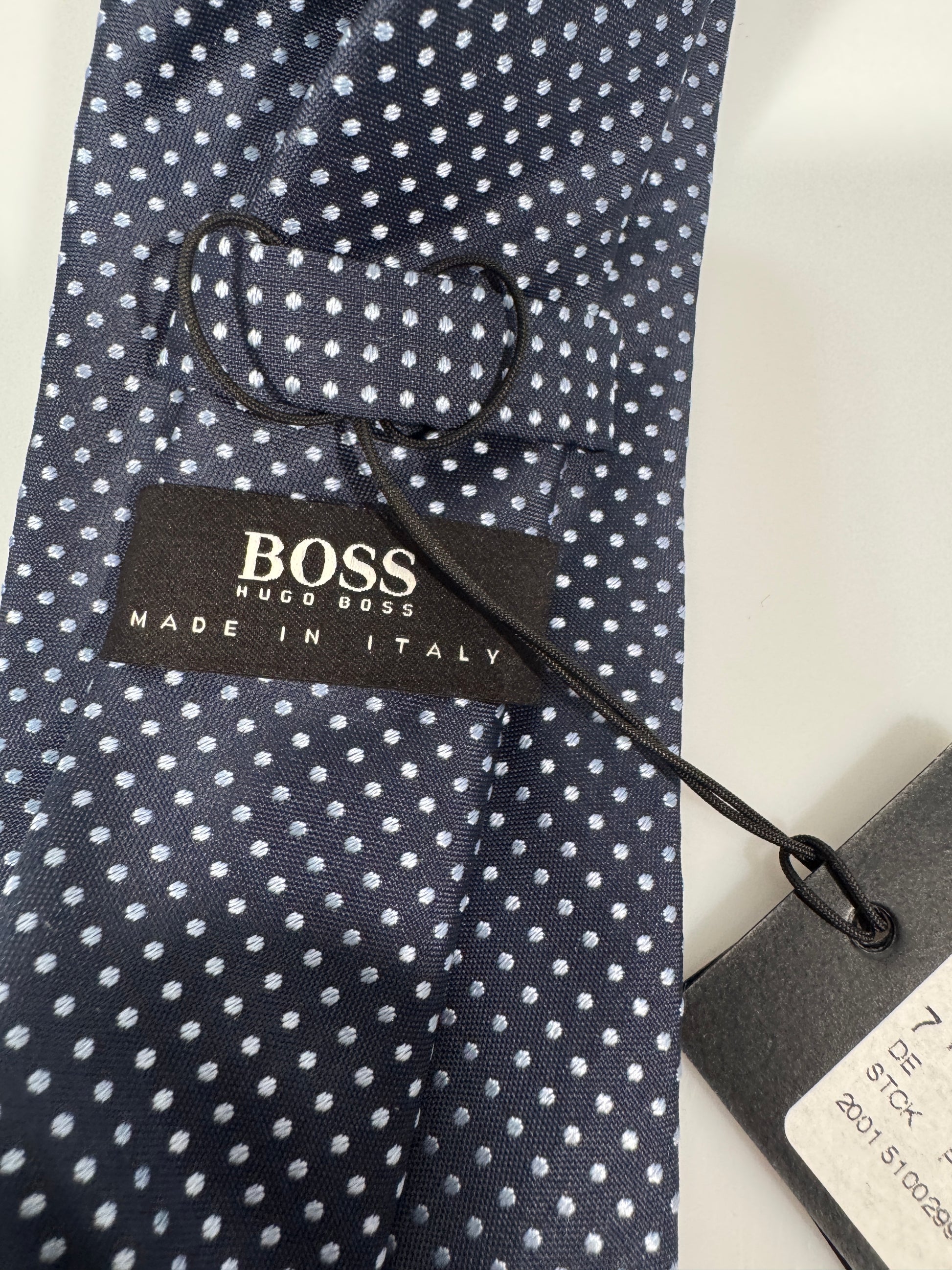 Cravată elegantă Hugo Boss, fabricată în Italia, realizată din 100% mătase premium, cu o textură fină și un model clasic cu puncte fine albe pe fond albastru închis. Este accesoriul ideal pentru bărbații care apreciază rafinamentul, calitatea și stilul business.