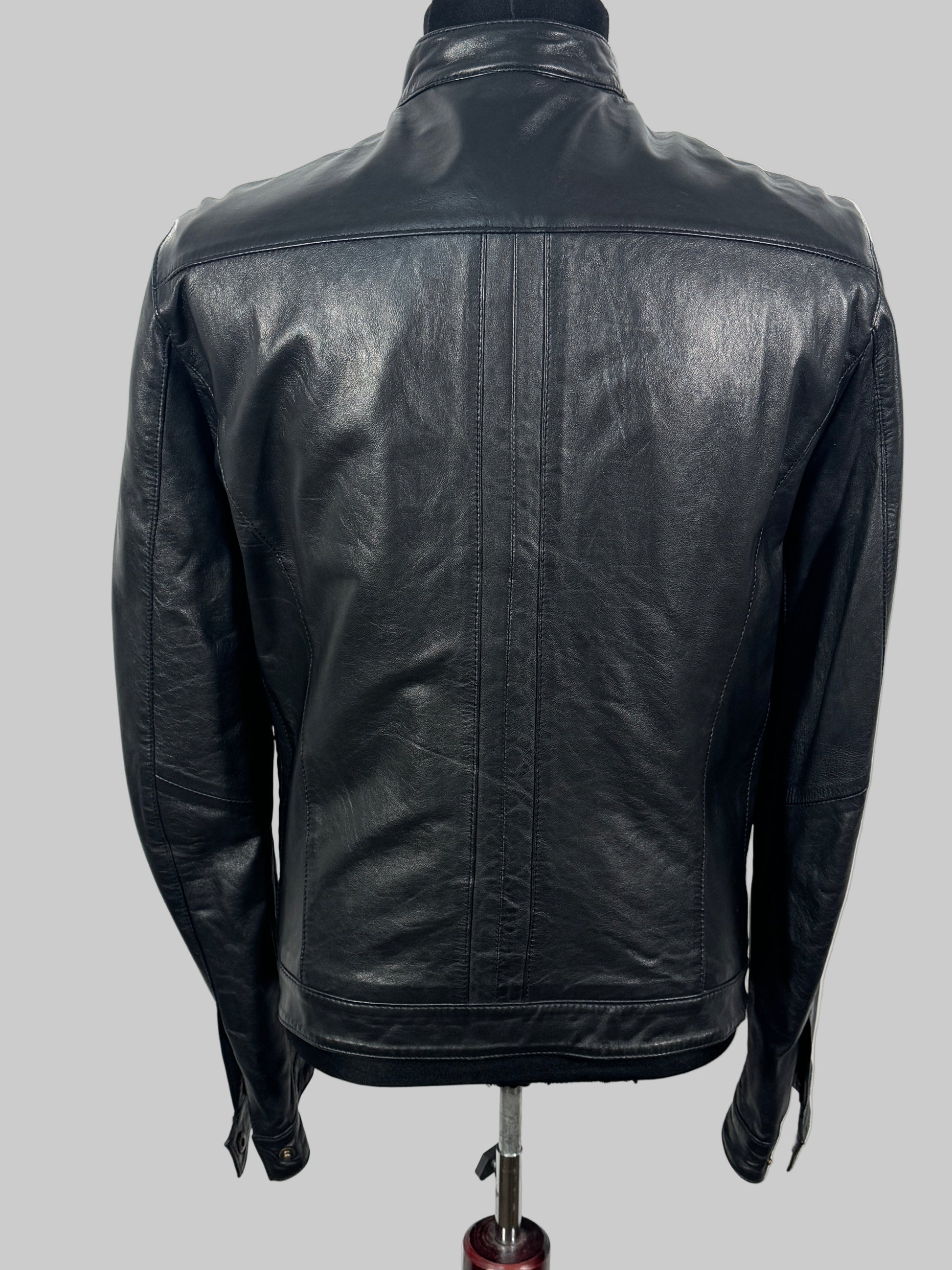 Această geacă Armani Exchange, realizată integral din piele naturală de calitate superioară, este o piesă statement, ideală pentru bărbatul care apreciază eleganța modernă și durabilitatea premium. Modelul cu închidere pe fermoar, gulerul cu capse și croiala slim conferă un look urban, rafinat și extrem de versatil.