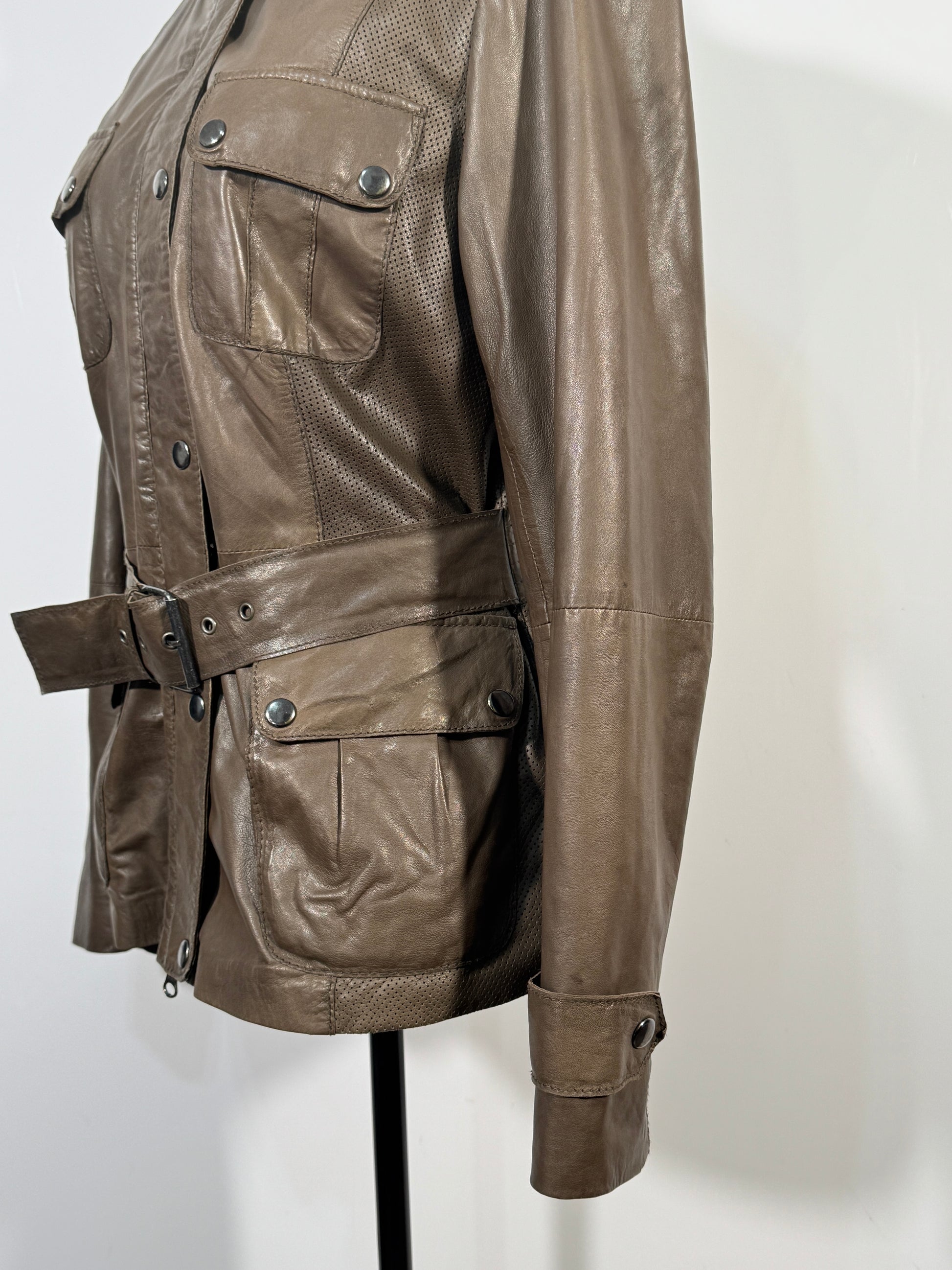 Detalii: Pielea este suplă și bine întreținută, prezentând patina naturală specifică materialului de calitate. Toate accesoriile metalice (capsele, catarama) sunt funcționale și în stare bună.