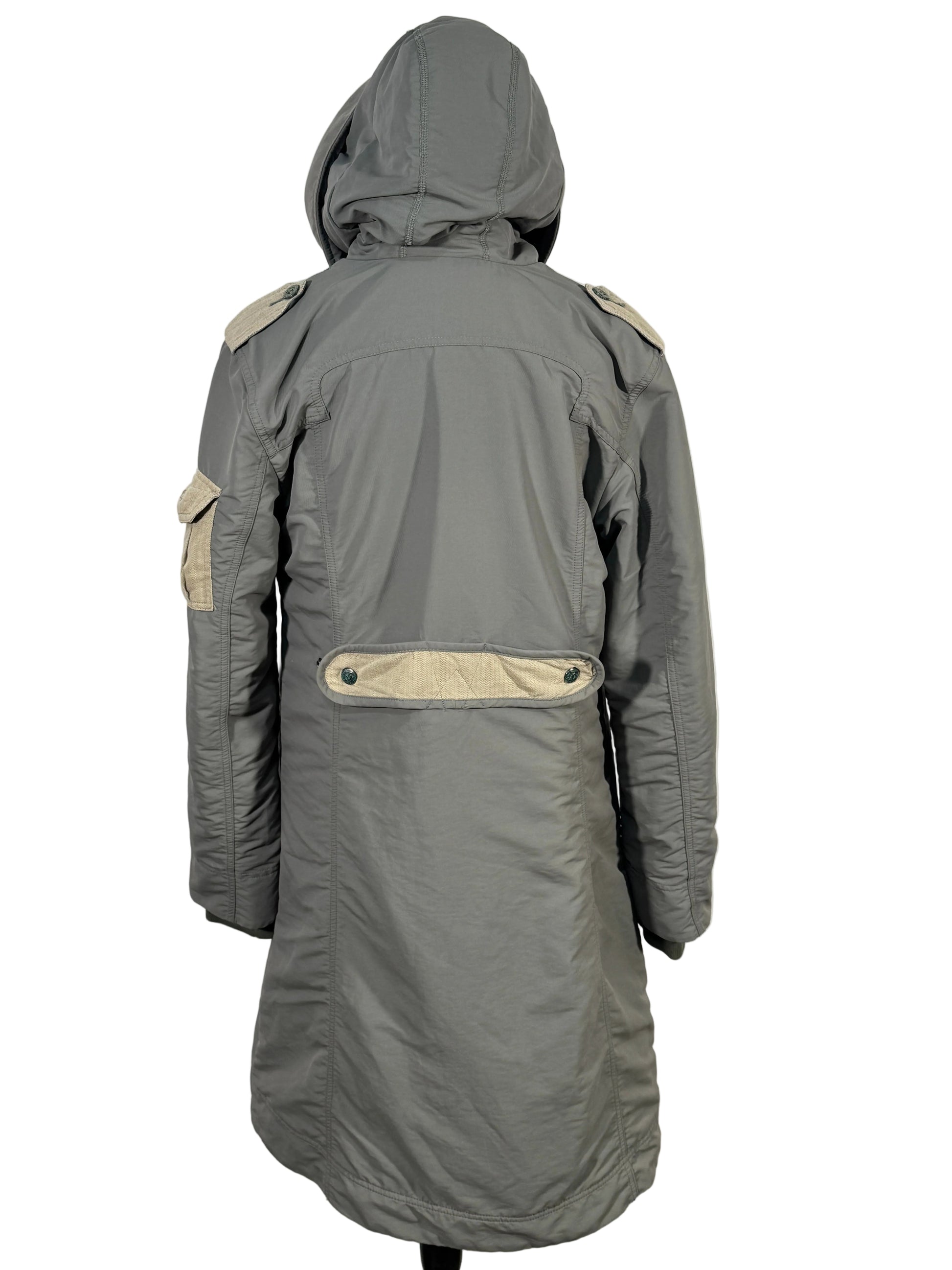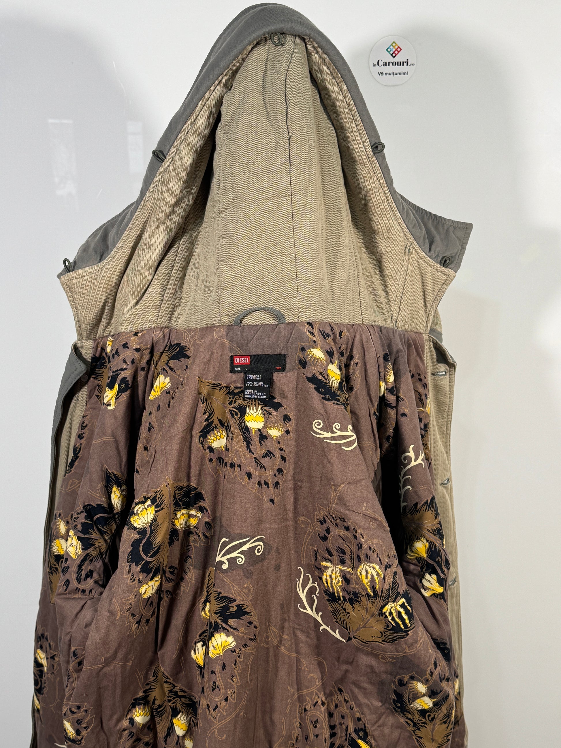 Geaca / trench Diesel pentru dama, model lung, cu gluga, potrivita pentru sezonul de tranzitie. Design modern, practic si usor de asortat, ideal pentru tinute casual sau urbane. Materialul este rezistent, iar croiala este feminina, cu lungime peste sold.