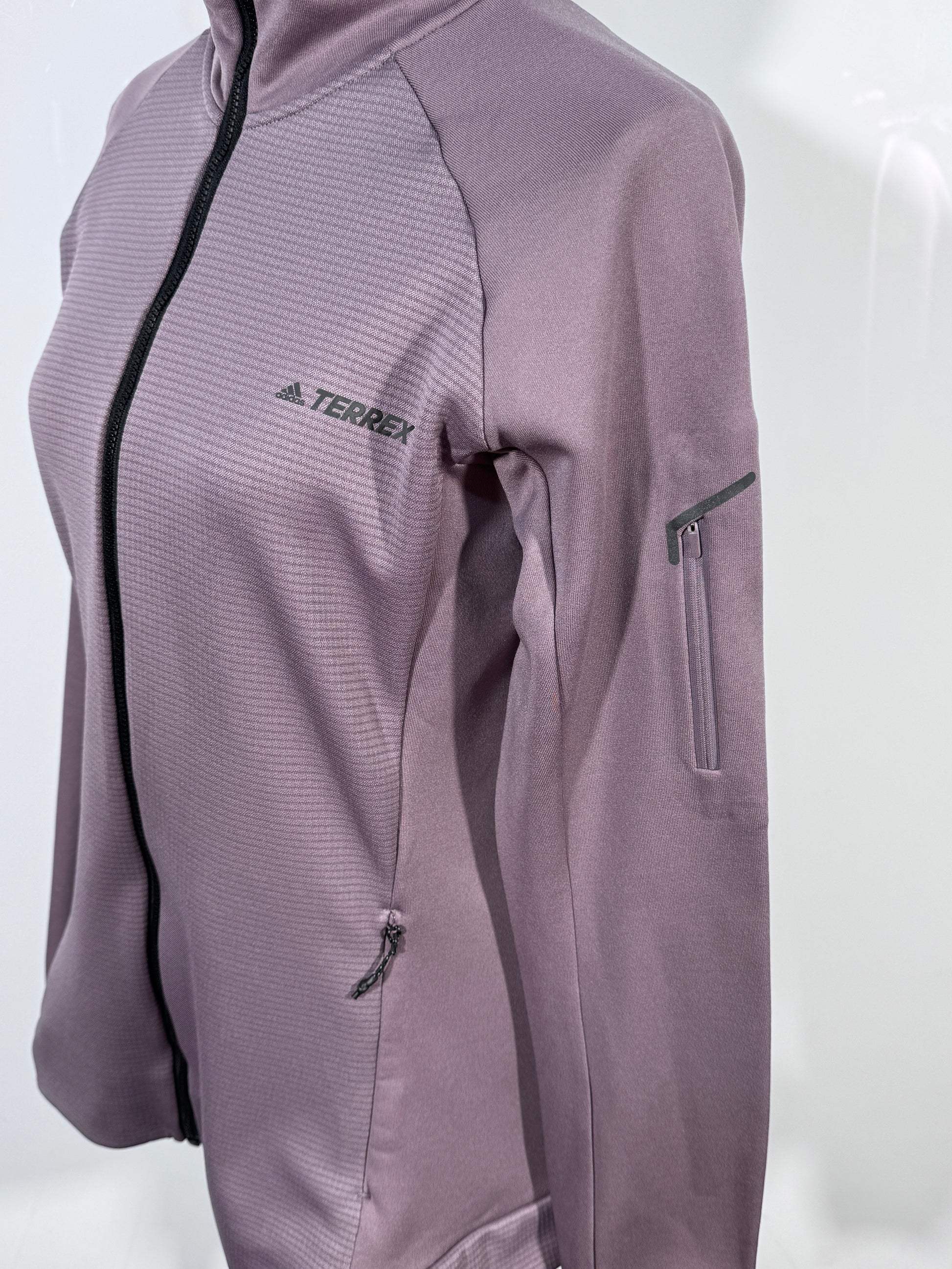 Performanță și confort într-un design minimalist. Acest hanorac Adidas Terrex utilizează tehnologia Polartec High Efficiency, oferind o textură grid (pătrățele) la interior care captează căldura și permite eliminarea rapidă a umezelii. Este piesa perfectă pentru hiking, alergare montană sau ca strat intermediar (mid-layer) sub o geacă de iarnă.