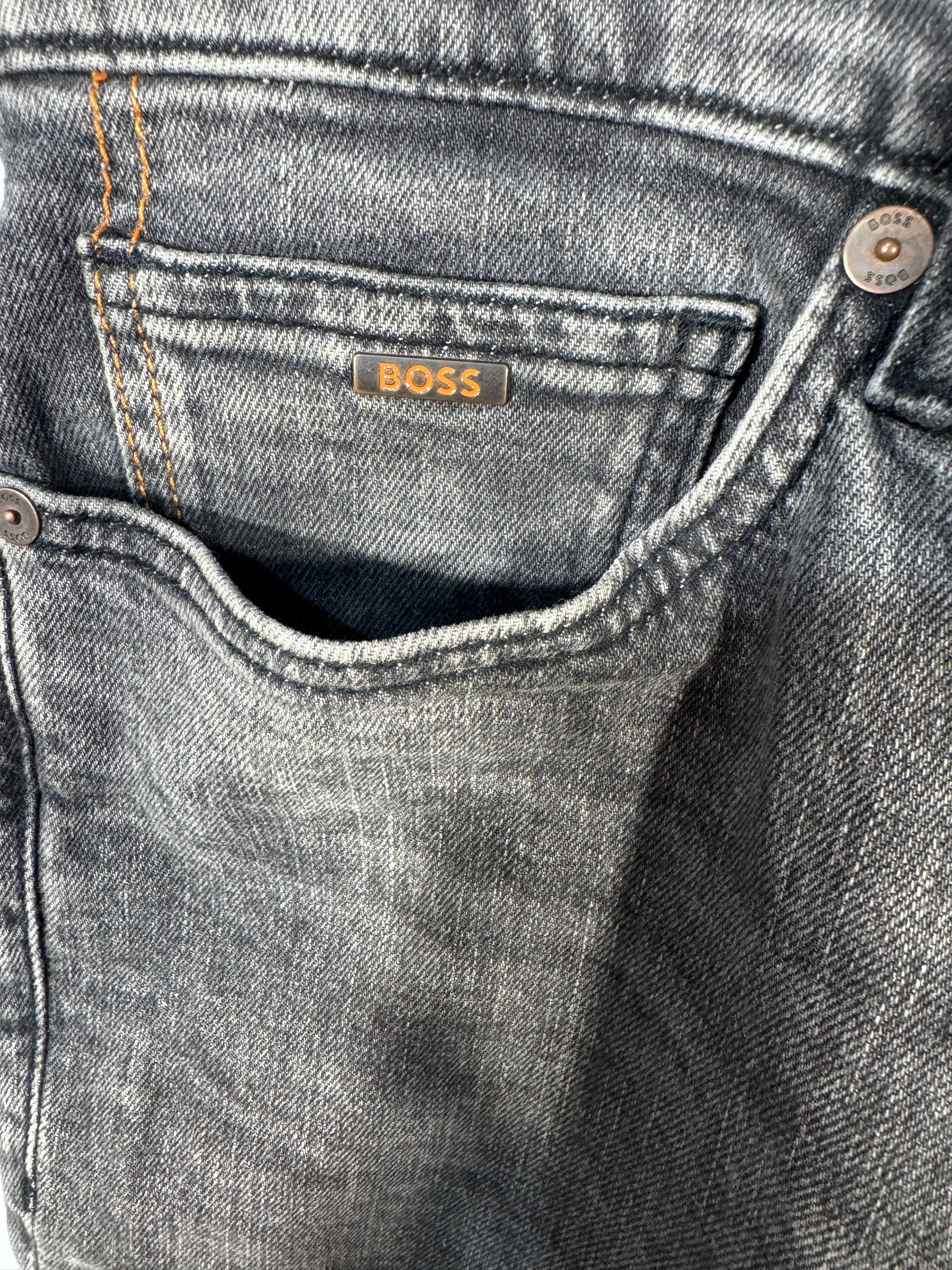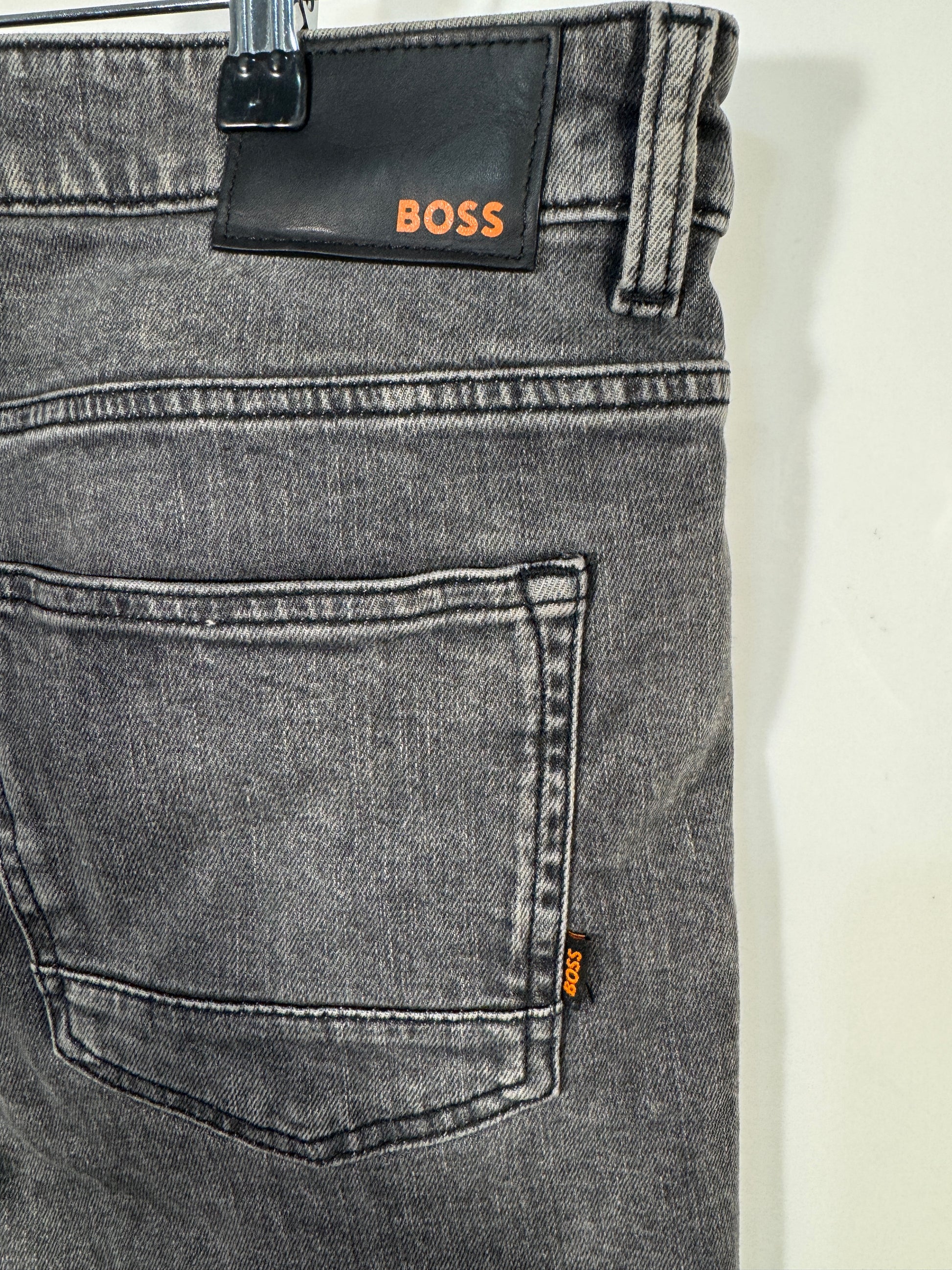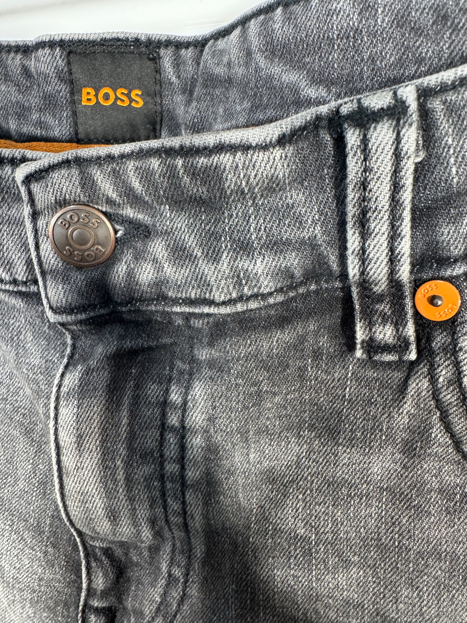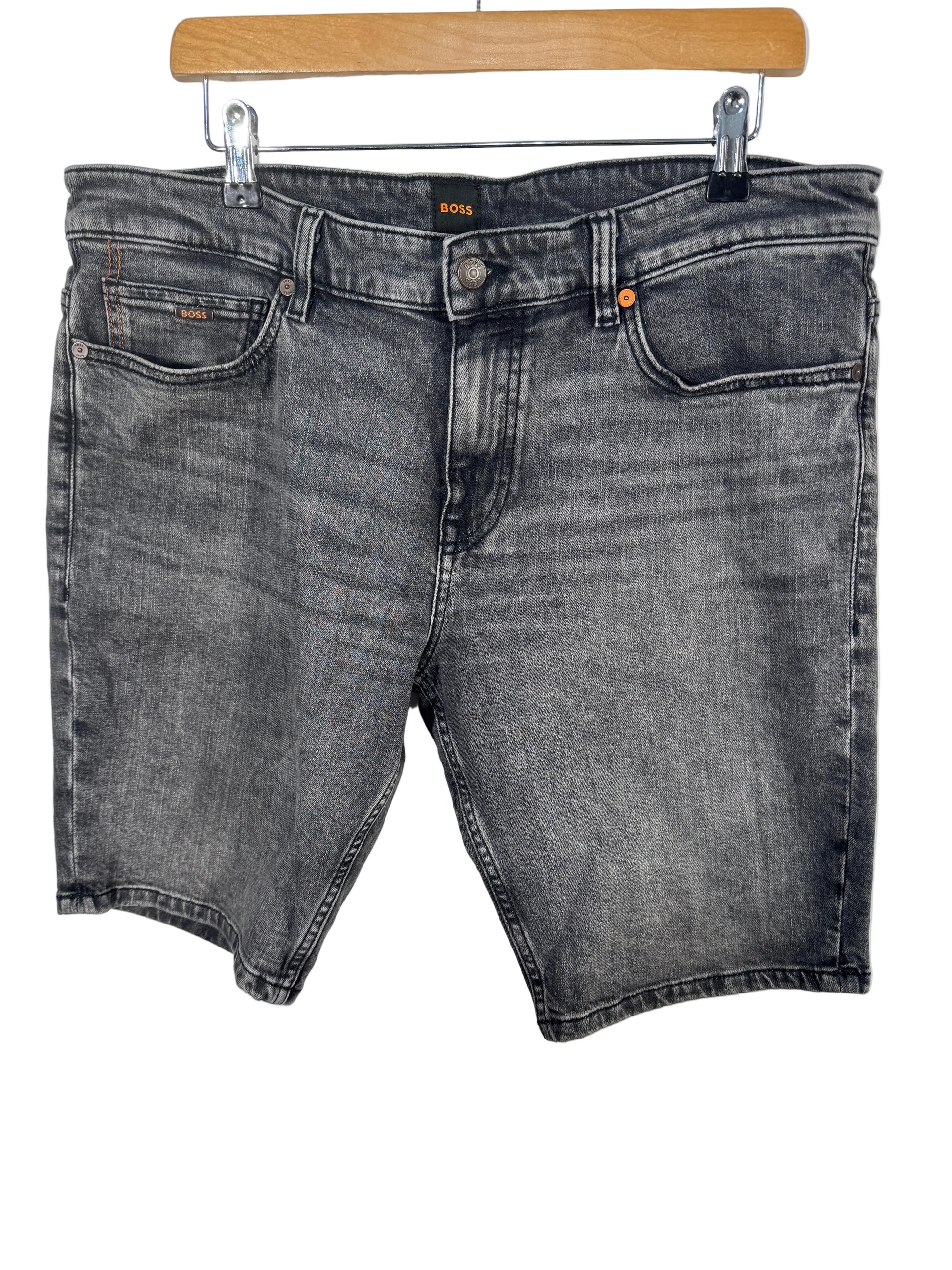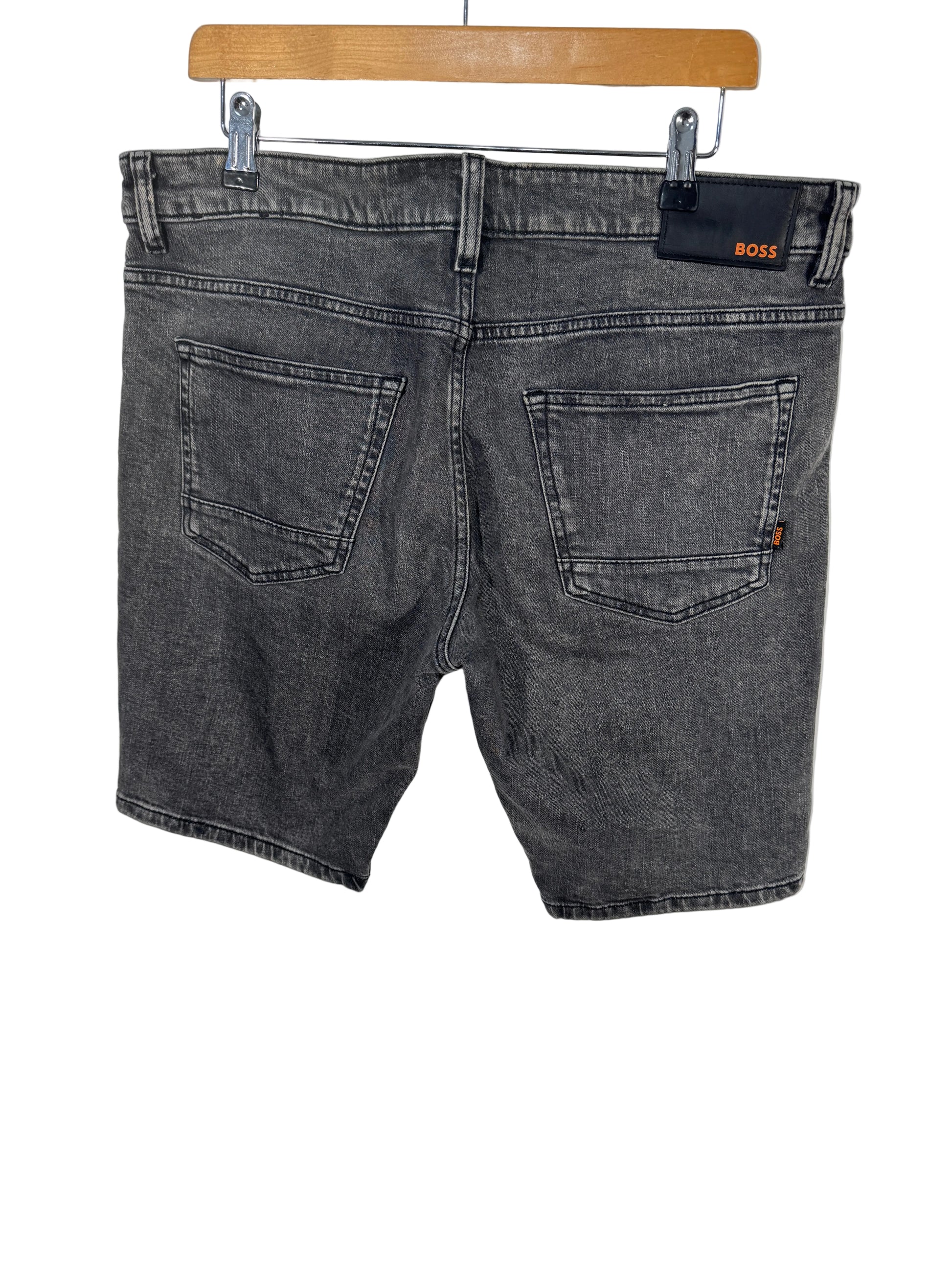 Pantaloni scurti din denim Hugo BOSS pentru barbati, marime W36 (echivalent aproximativ XL), culoare gri prespalat.
