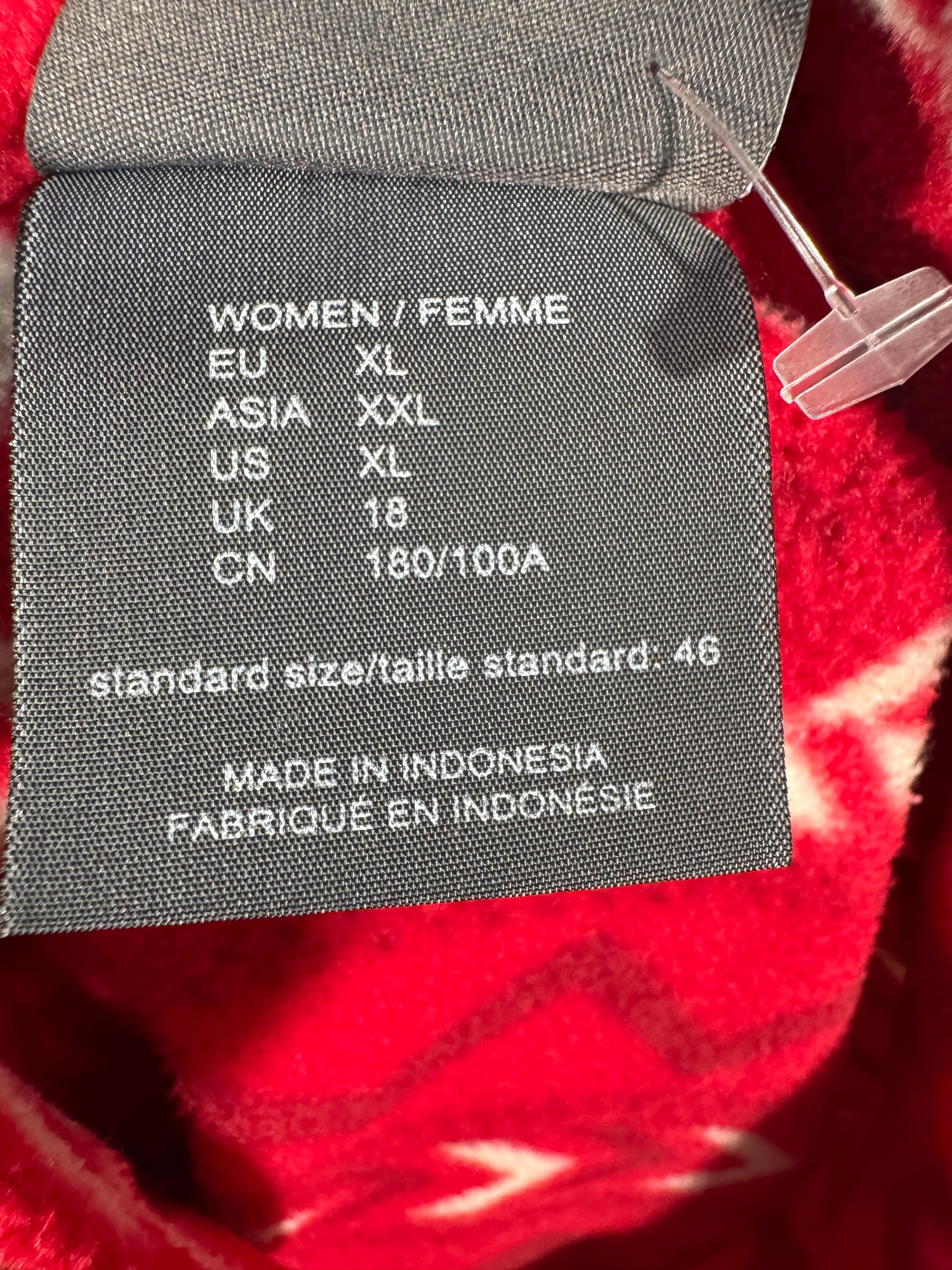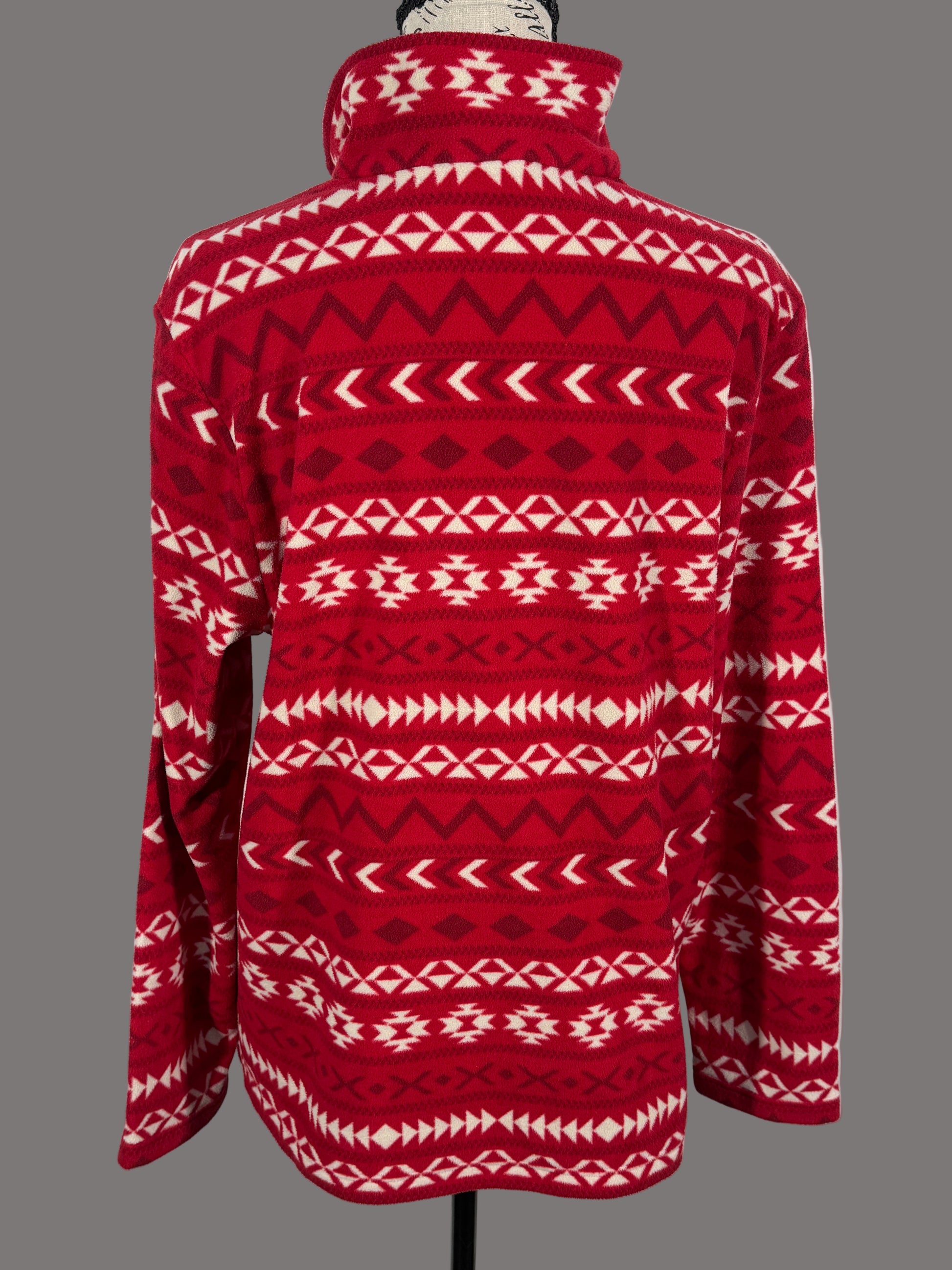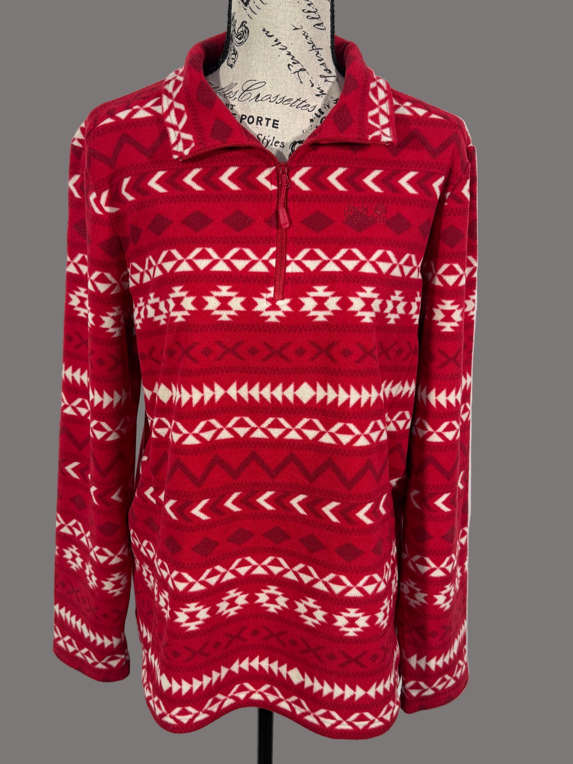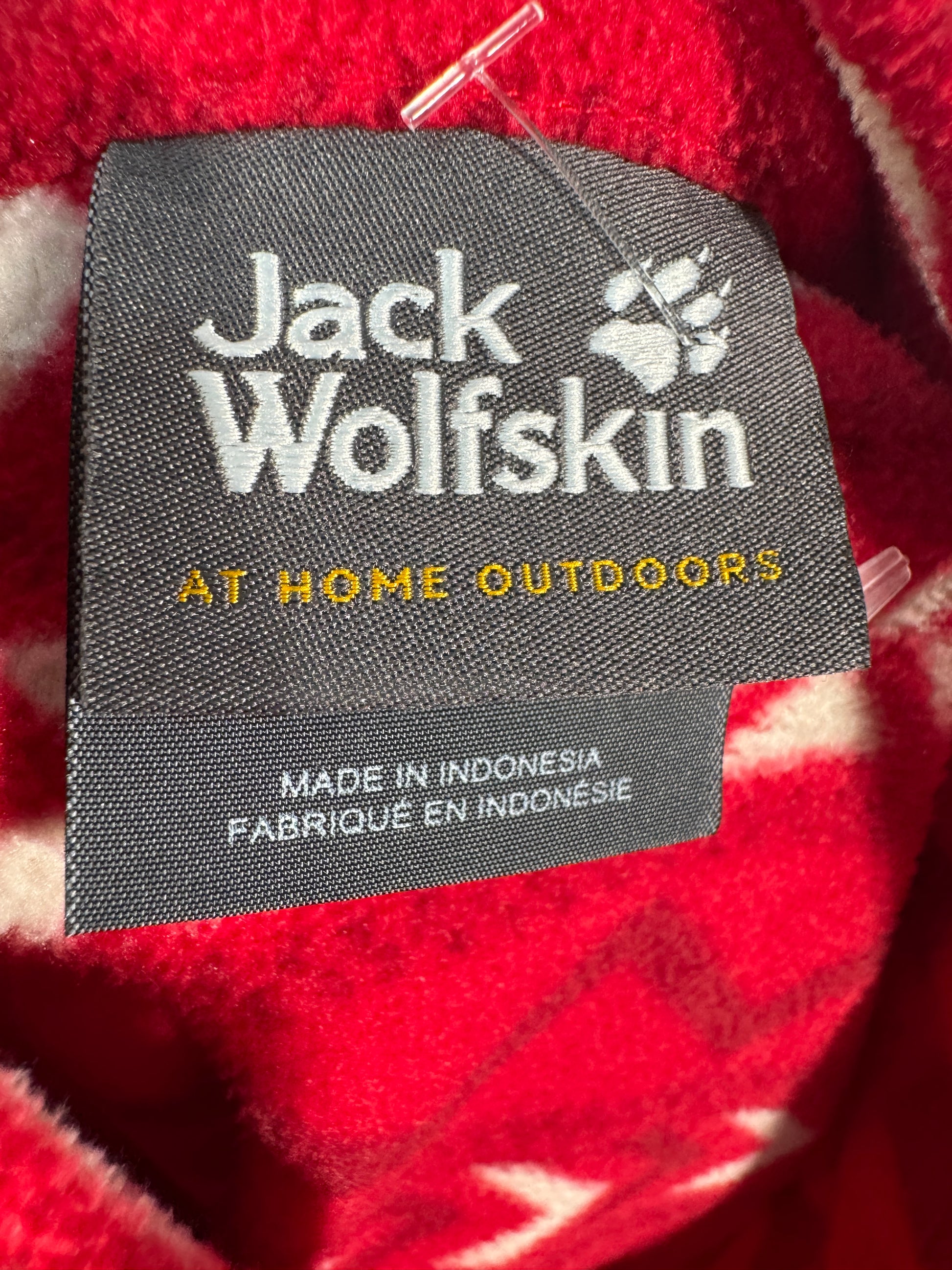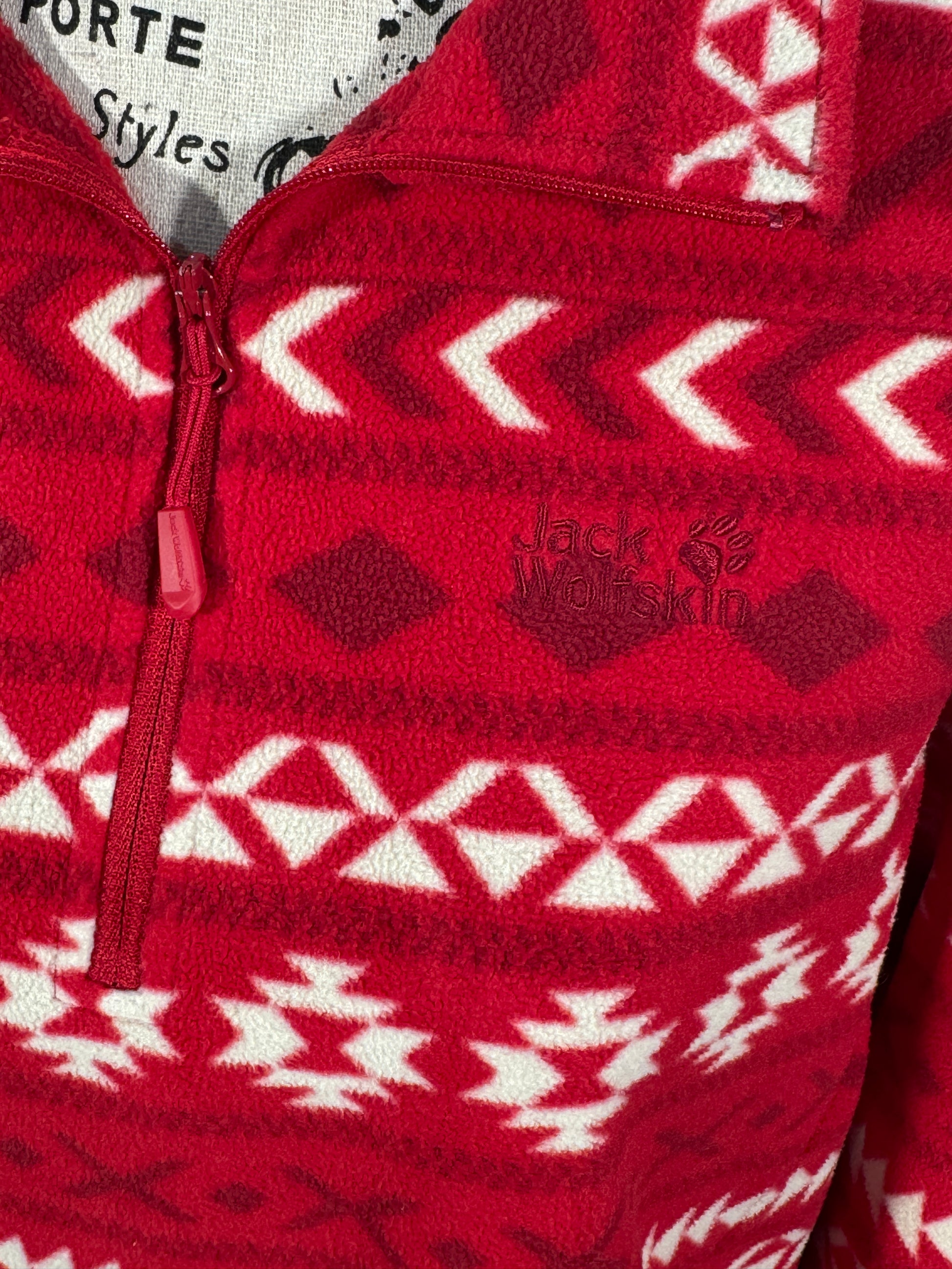 Polar călduros Jack Wolfskin, confecționat din material fleece moale, cu un design vesel în nuanțe de roșu și alb. Ideal pentru sezonul rece, oferă confort termic și libertate de mișcare, perfect pentru drumeții, activități outdoor sau ținute casual de zi cu zi.