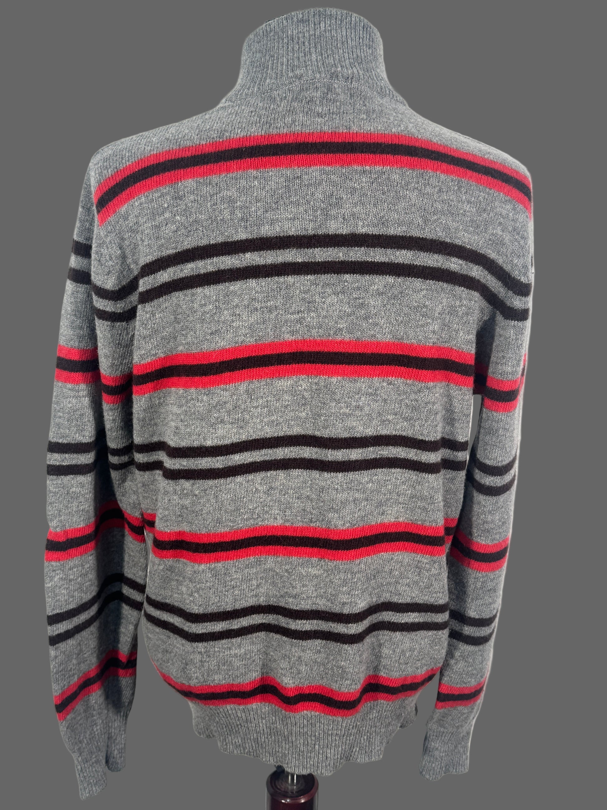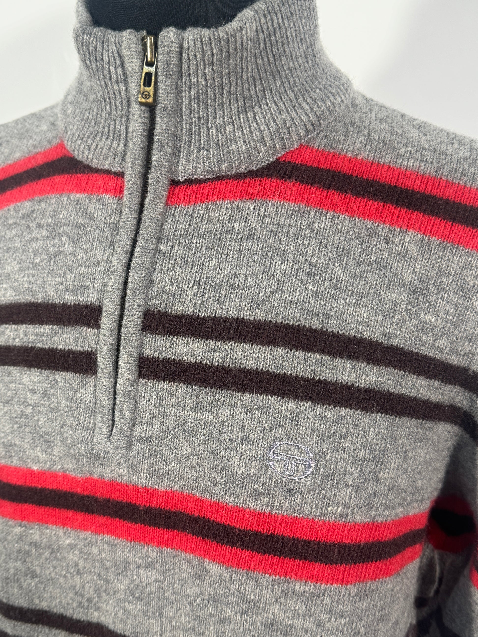 Pulover Sergio Tacchini confecționat din lână de calitate superioară, ideal pentru zilele reci de toamnă și iarnă. Designul clasic cu dungi orizontale și guler înalt cu fermoar îl face potrivit atât pentru ținute casual, cât și pentru un stil sport-elegant.