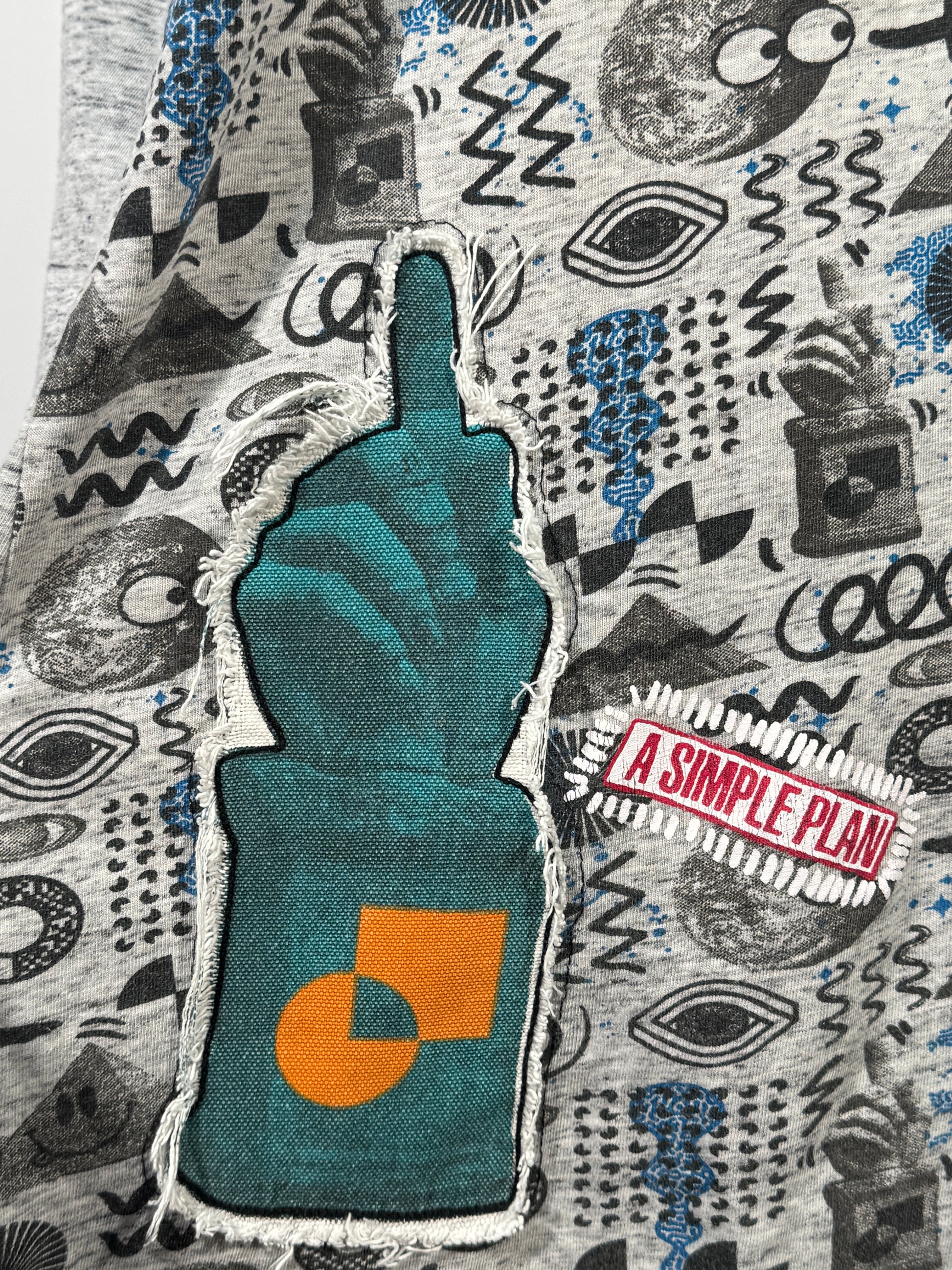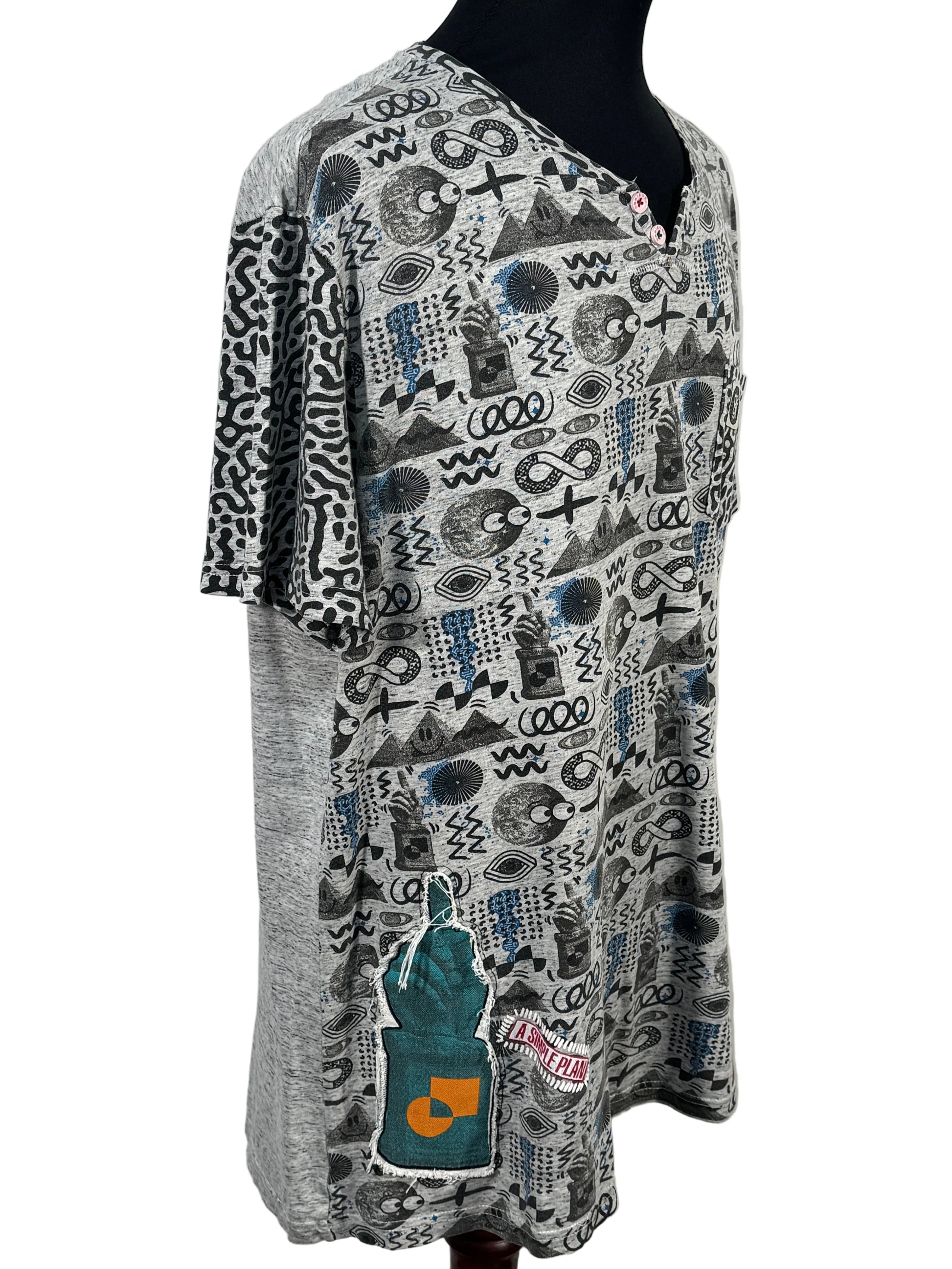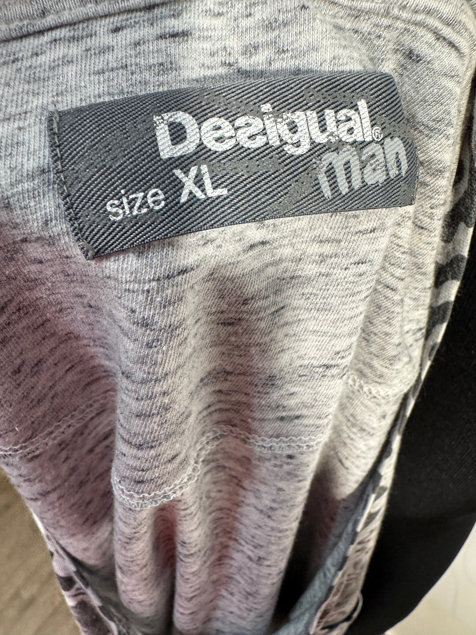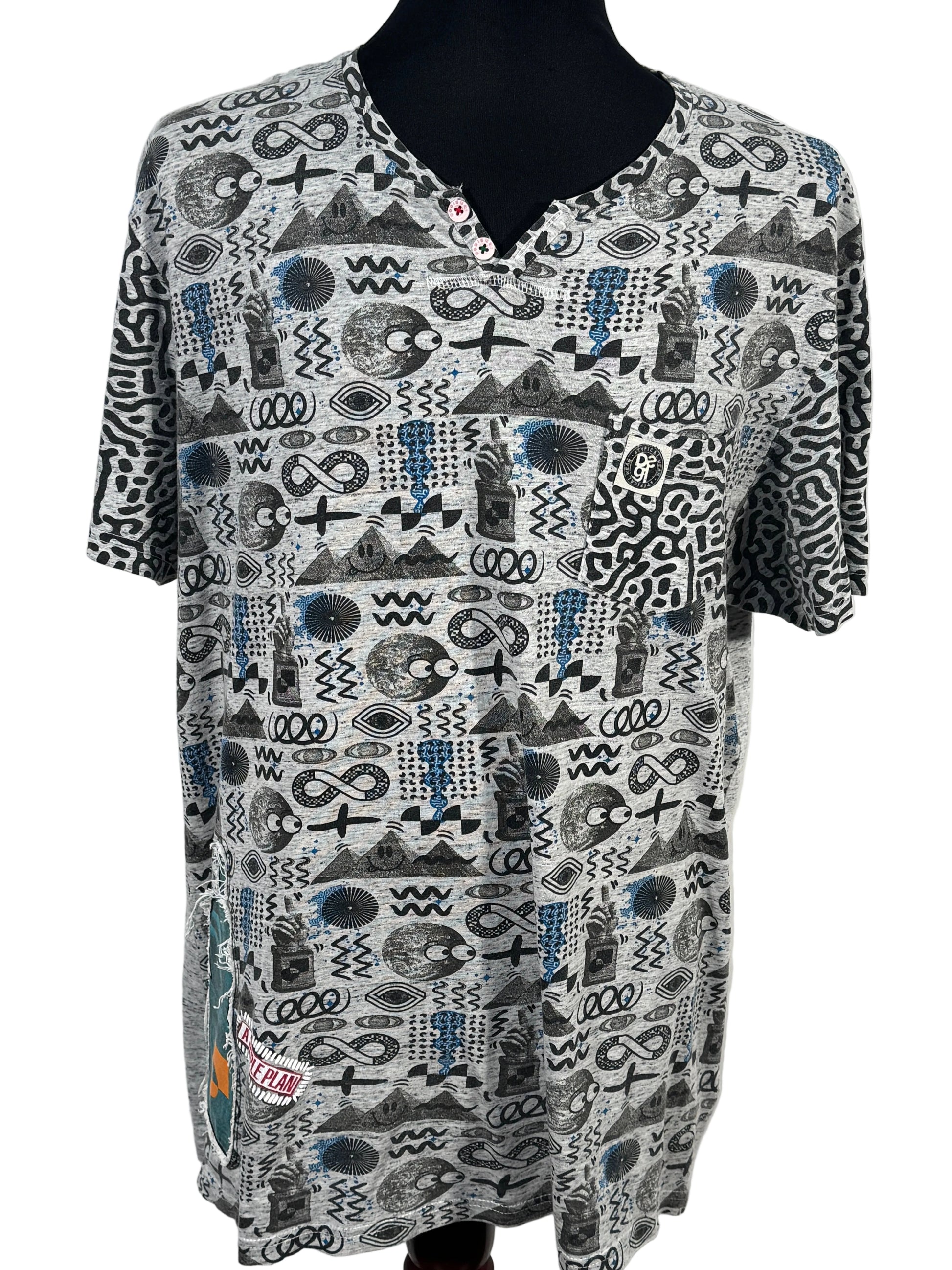 Tricou Desigual pentru barbati, marimea XL, cu imprimeu grafic all-over in nuante de gri, negru si albastru. Model cu decolteu in V si nasturi decorativi. Material confortabil, potrivit pentru tinute casual de zi cu zi. Croi lejer, usor de purtat cu blugi sau pantaloni casual.